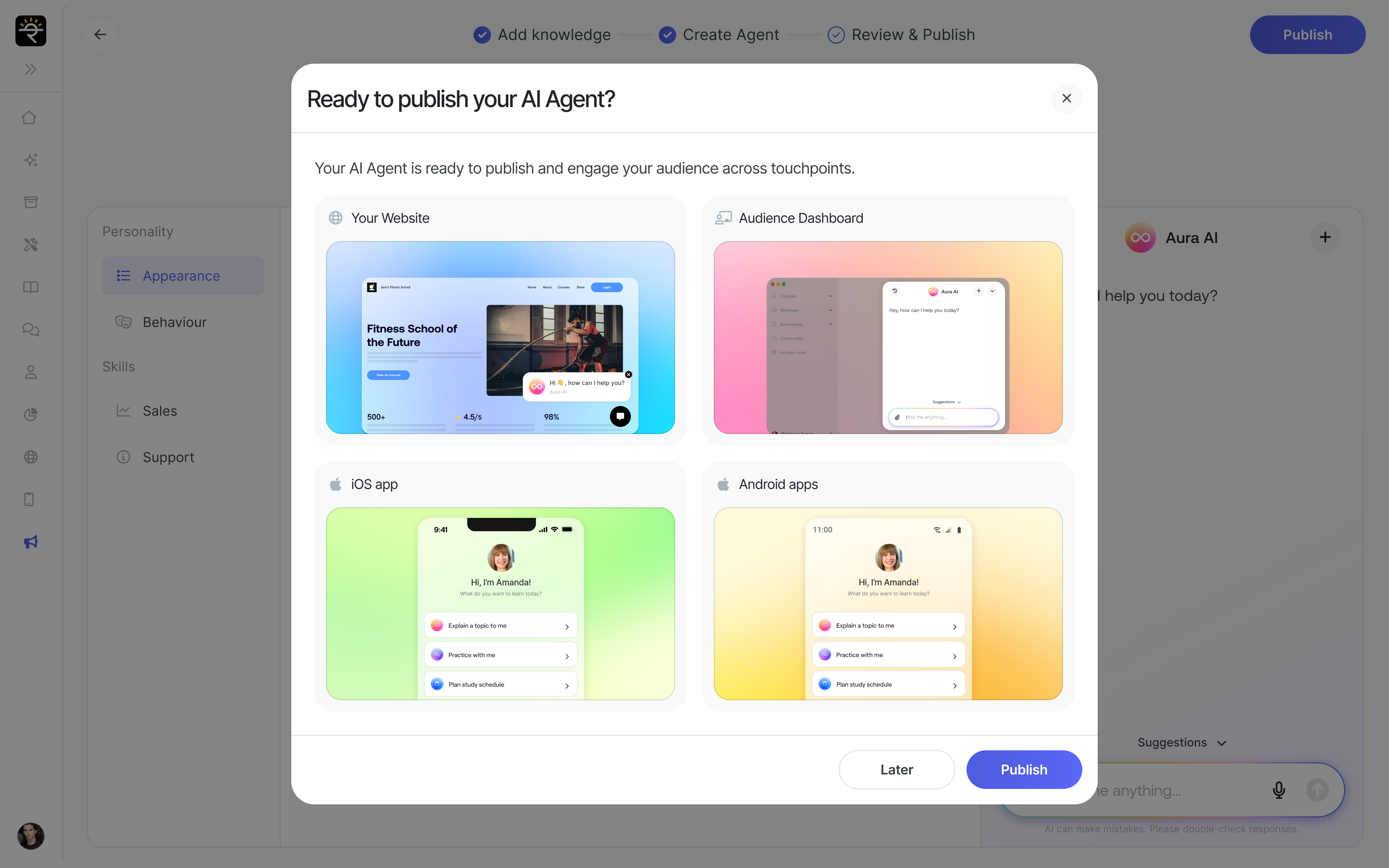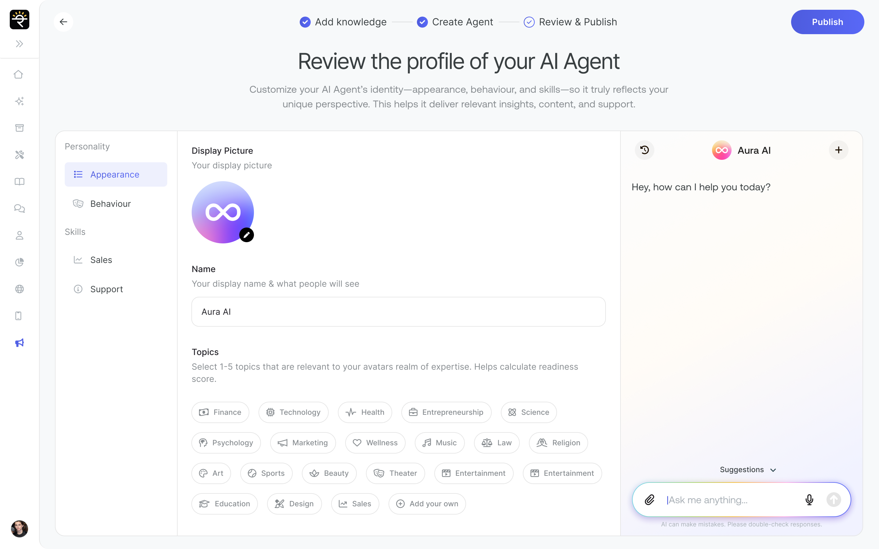 You’ll see live changes on the right for your profile and name, so you know exactly how your agent will appear to learners.Step 4: Click Publish to make your agent live. You’ll then see where learners can find and use it.