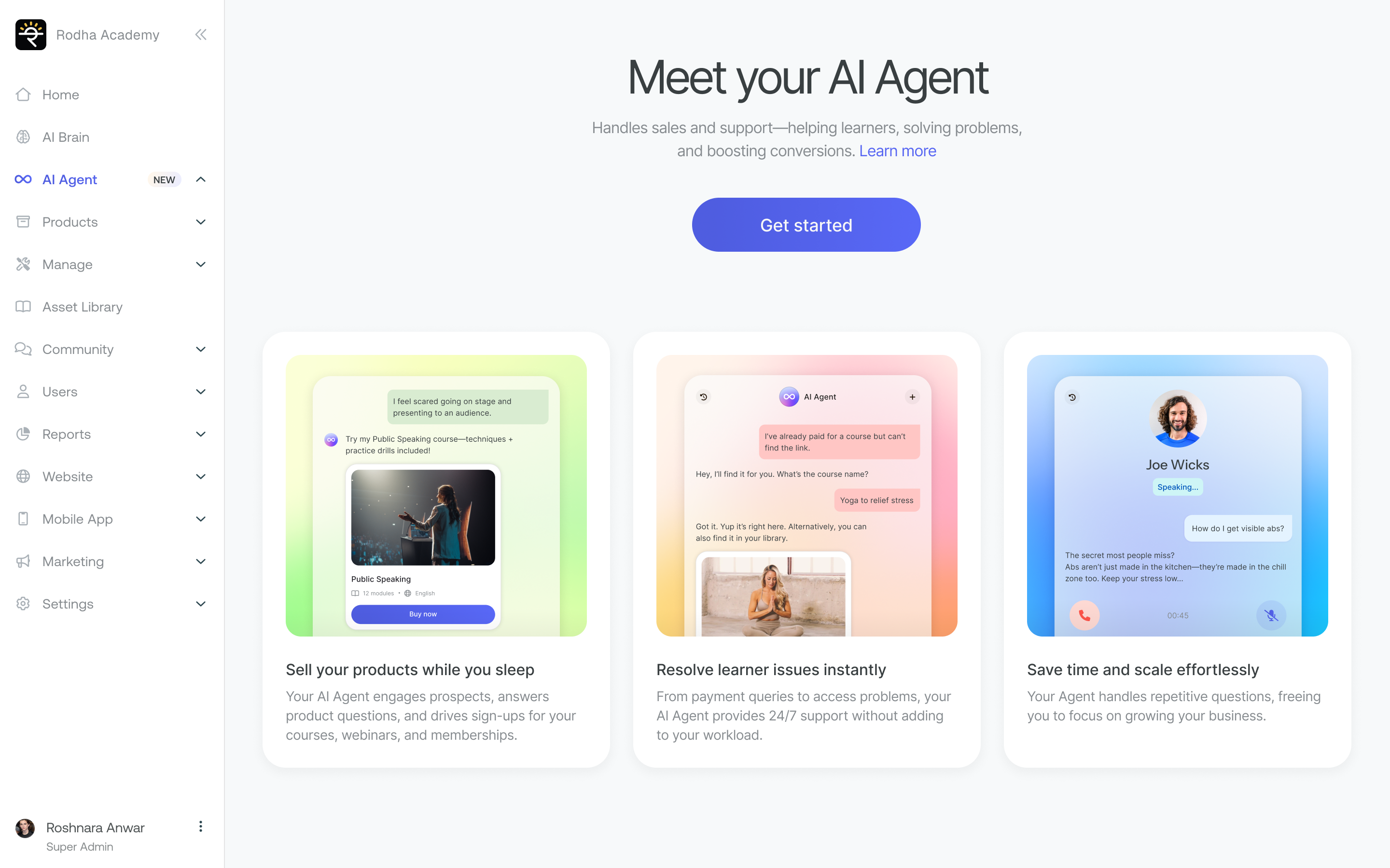 An AI Agent works as your always-available sales and support partner, ensuring that learners get instant answers, consistent guidance, and reliable help even when you’re offline. When set up right, it helps you reach more learners, scale your business, and deliver a more personal experience to each learner.