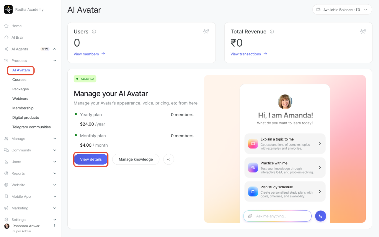 Step 1: Go to Products from the left navbar of your Seekhly dashboard and select AI Avatar and then view details