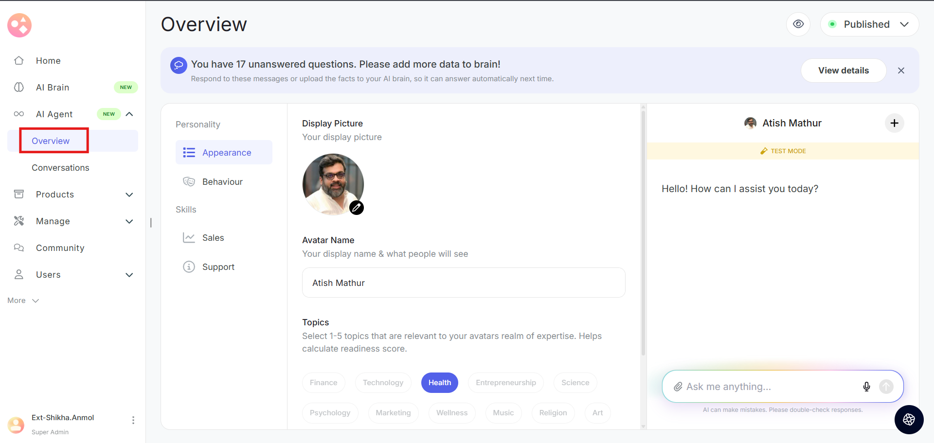 Step 1: Go to AI Agent in the left navbar of your Seekhly dashboard and click on Overview