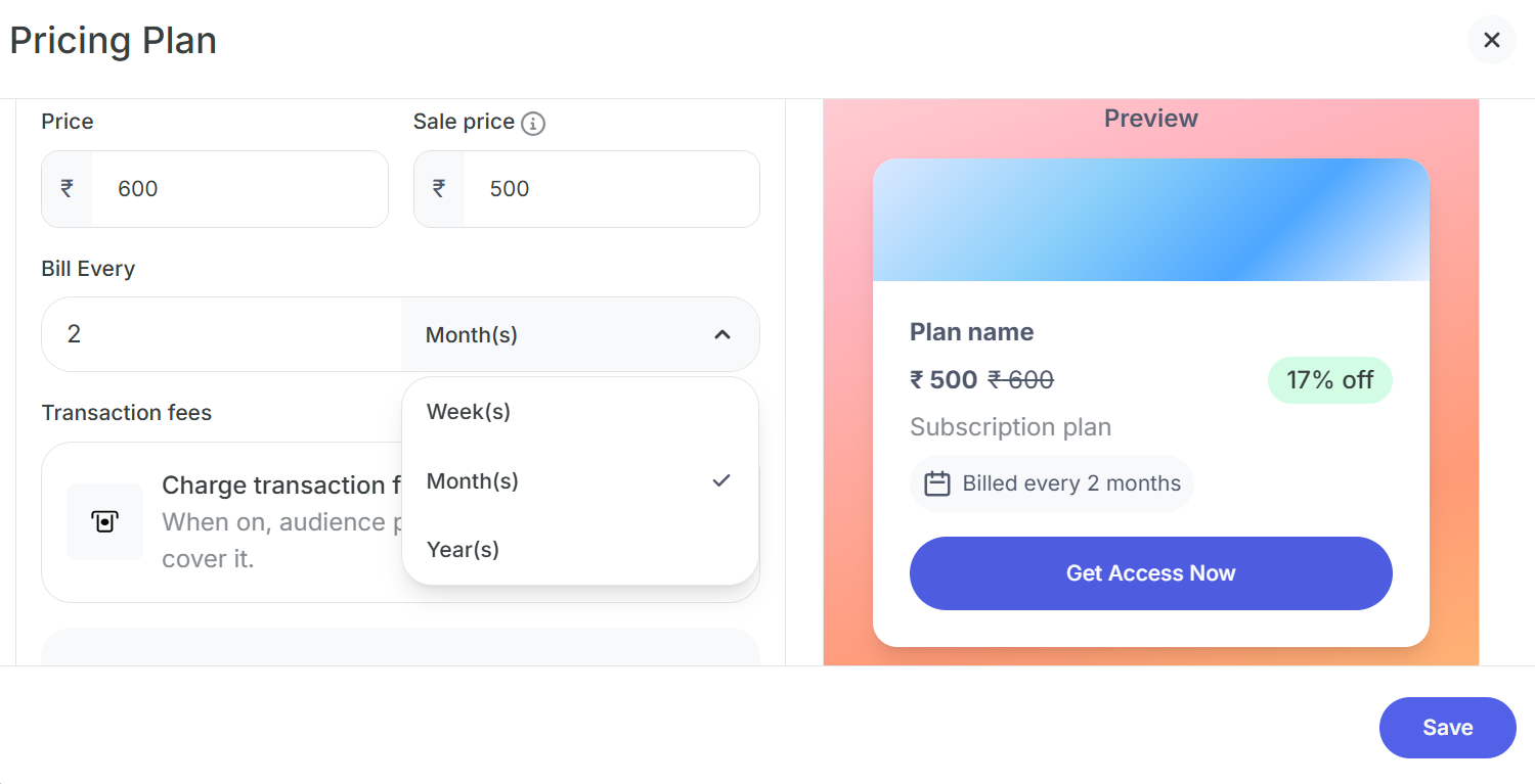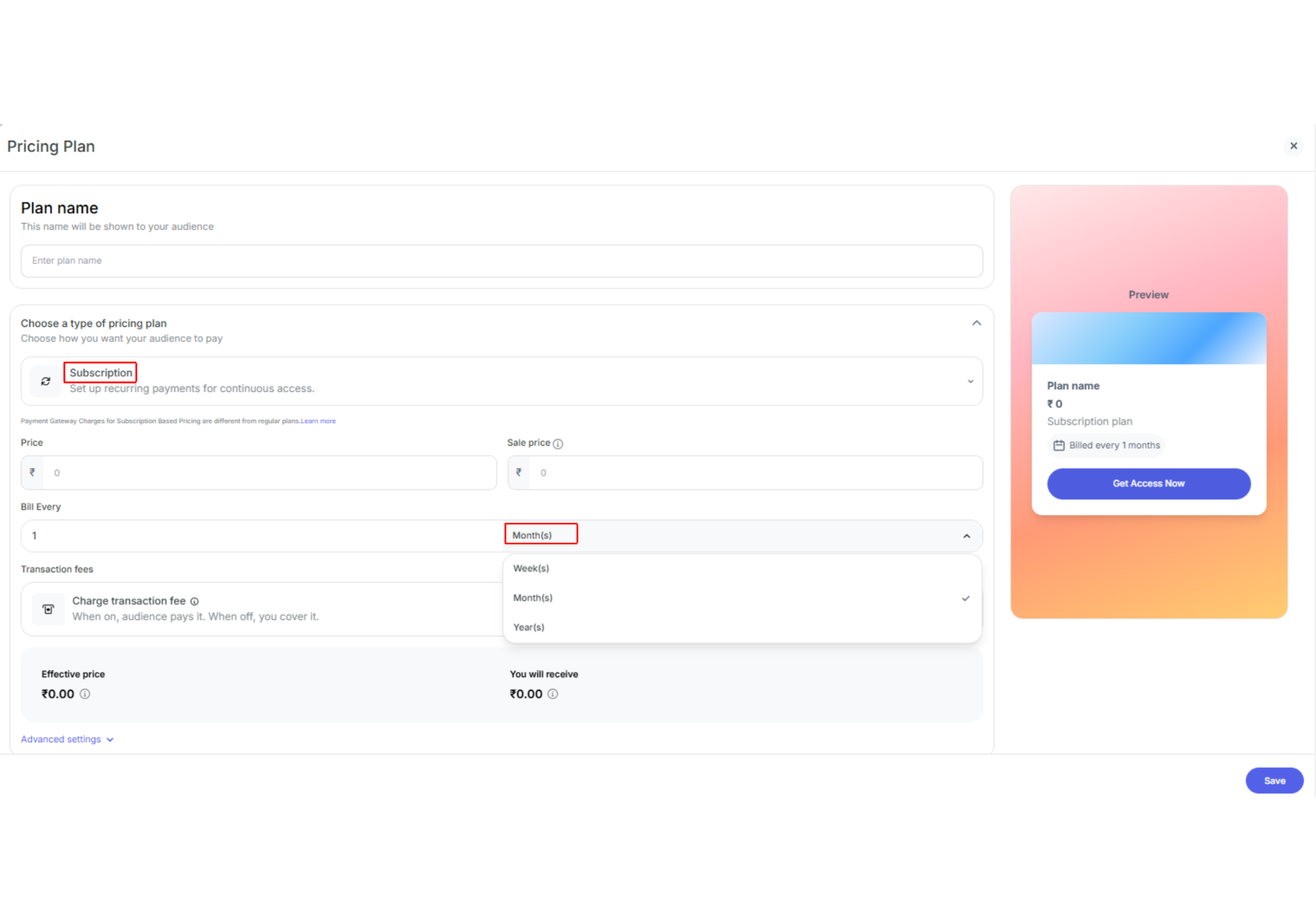 Example: Setting "1" and "Month(s)" means subscribers will be billed ₹X every 1 month - this creates monthly recurring revenue.