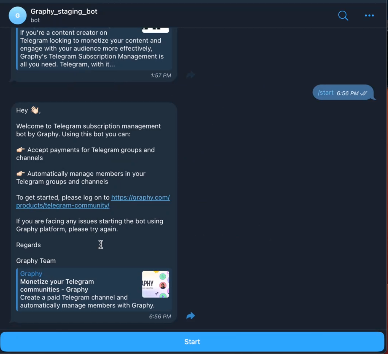 The bot will greet you with: "Hey ?, Welcome to Telegram subscription management bot by Seekhly. Using this bot you can: