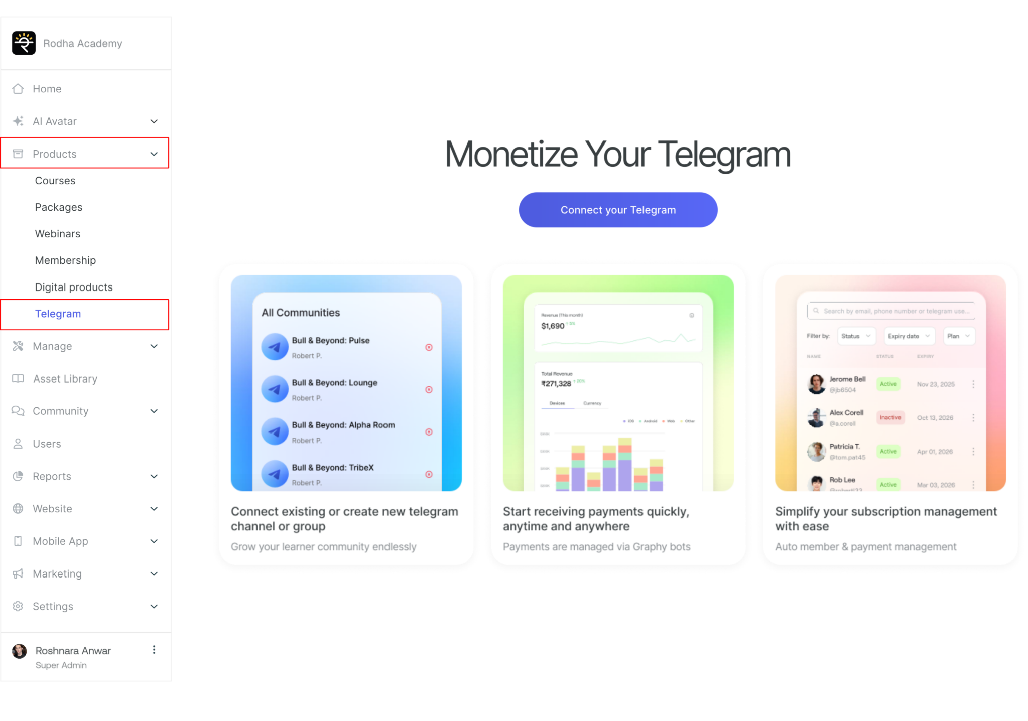 Navigate to the left navigation panel in your Seekhly dashboard and select "Products" > "Telegram". This is where you'll set up and manage your monetized Telegram communities.