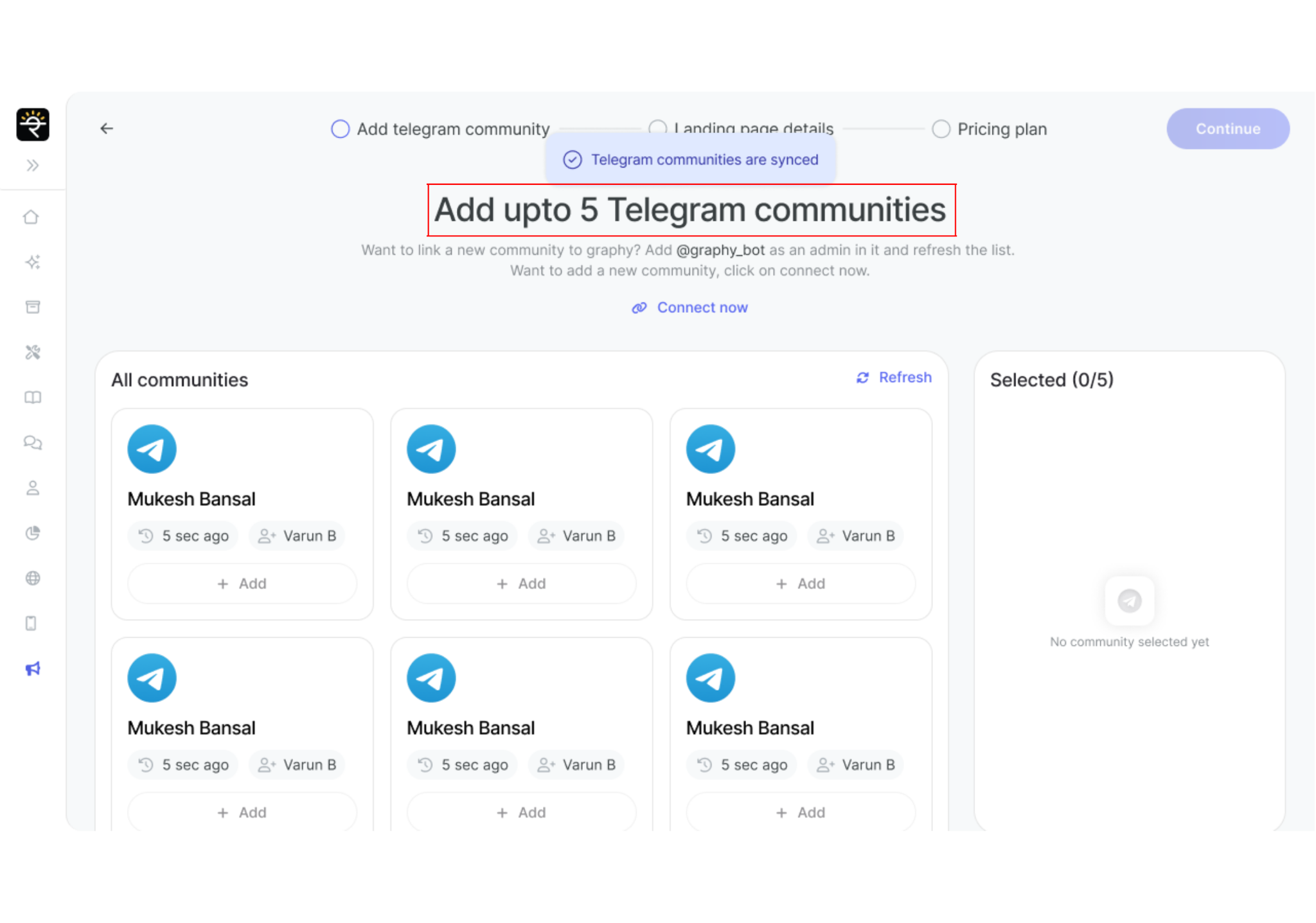 Click the "+ Add" button on each community you want to sell. Selected communities will appear in the "Selected" panel on the right side. Once you've selected the communities, you'll see a tooltip message: "You can add max 5 communities." Click "Continue" to proceed to the landing page setup.