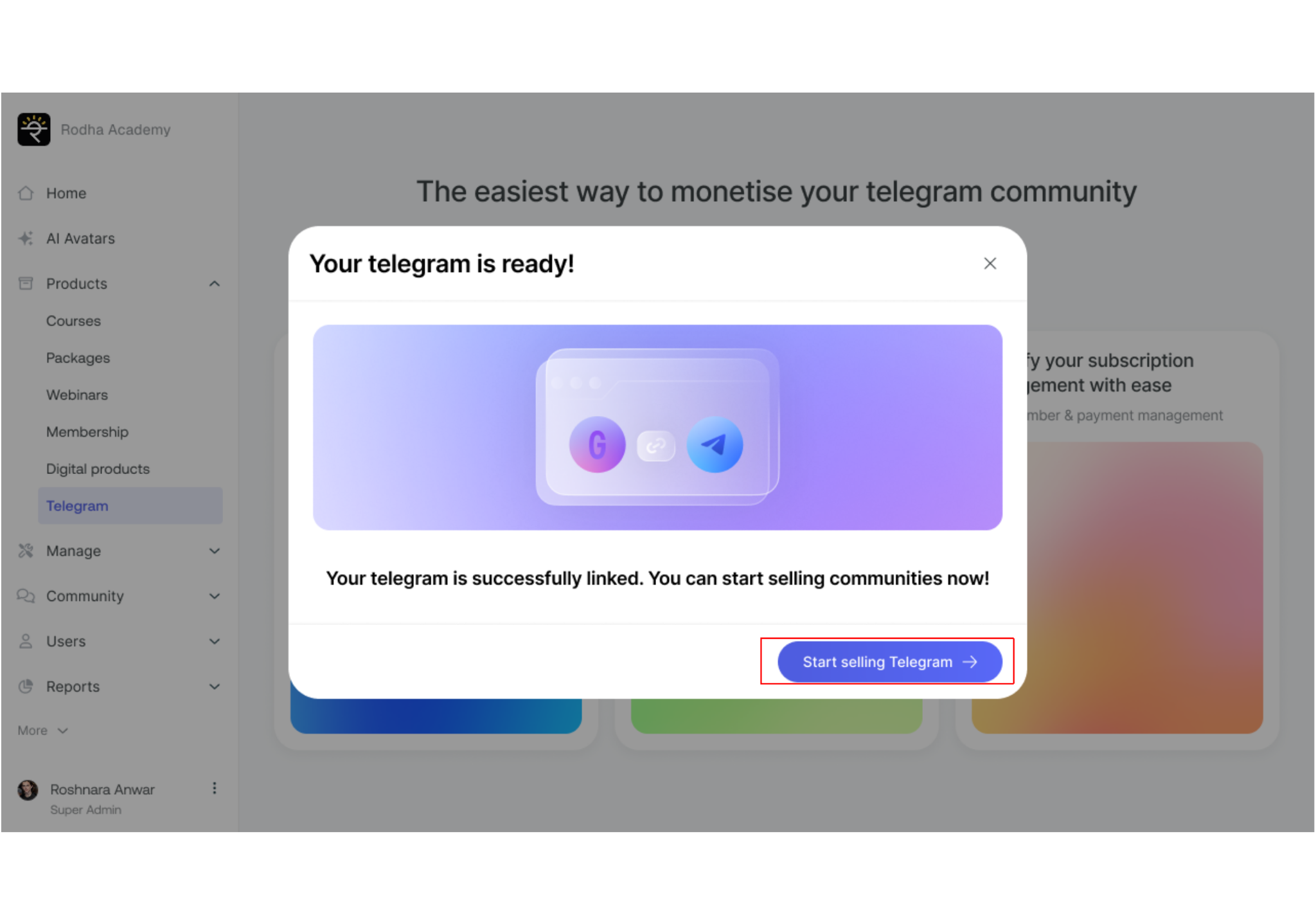 Your telegram is successfully linked. You can start selling communities now! Click on the "Start selling Telegram" button to proceed.