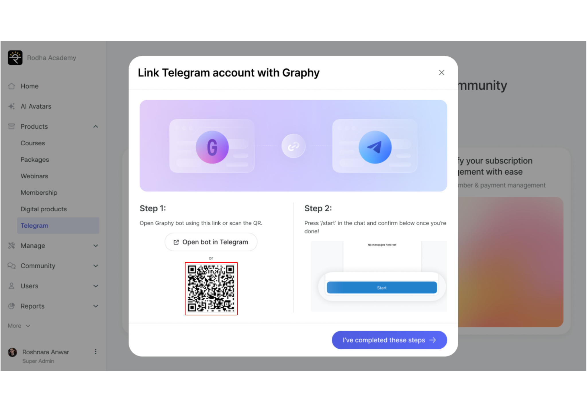 Click on the "Connect your Telegram" button to begin the process of creating and managing your Telegram community.