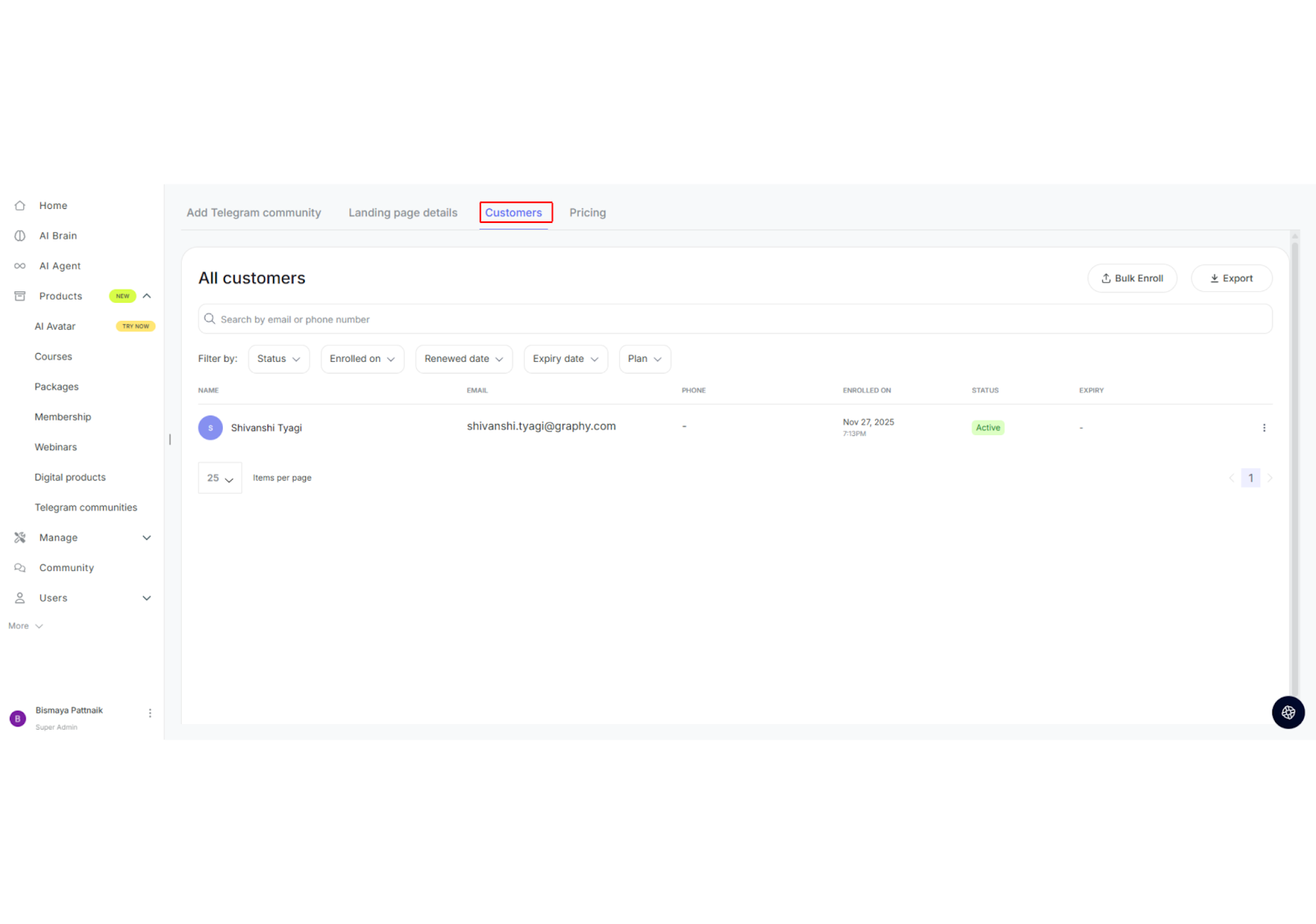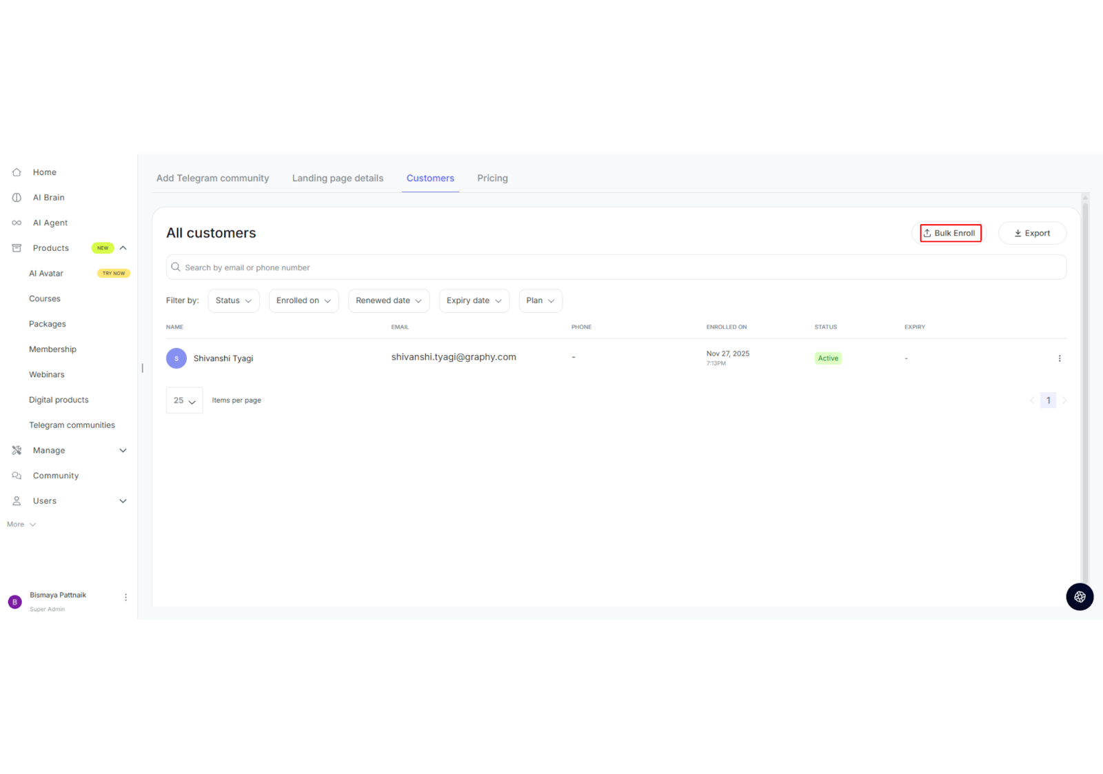 You'll see the "All customers" page with a list of enrolled users. At the top right, you'll find the "Bulk Enroll" button.