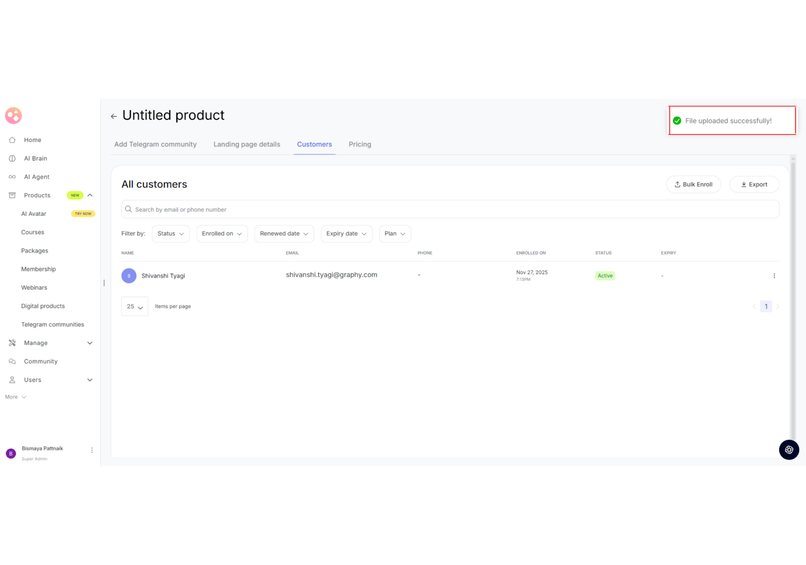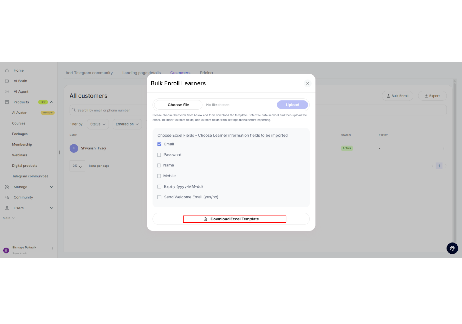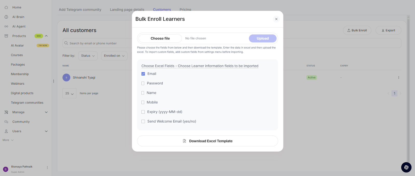This article is a step-by-step guide to bulk enrolling learners into your Telegram community on Seekhly. This feature allows you to add multiple users at once by uploading an Excel file with their information.