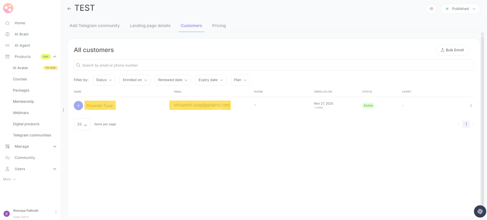 Go to your Telegram community product page and click on the "Customers" tab at the top.