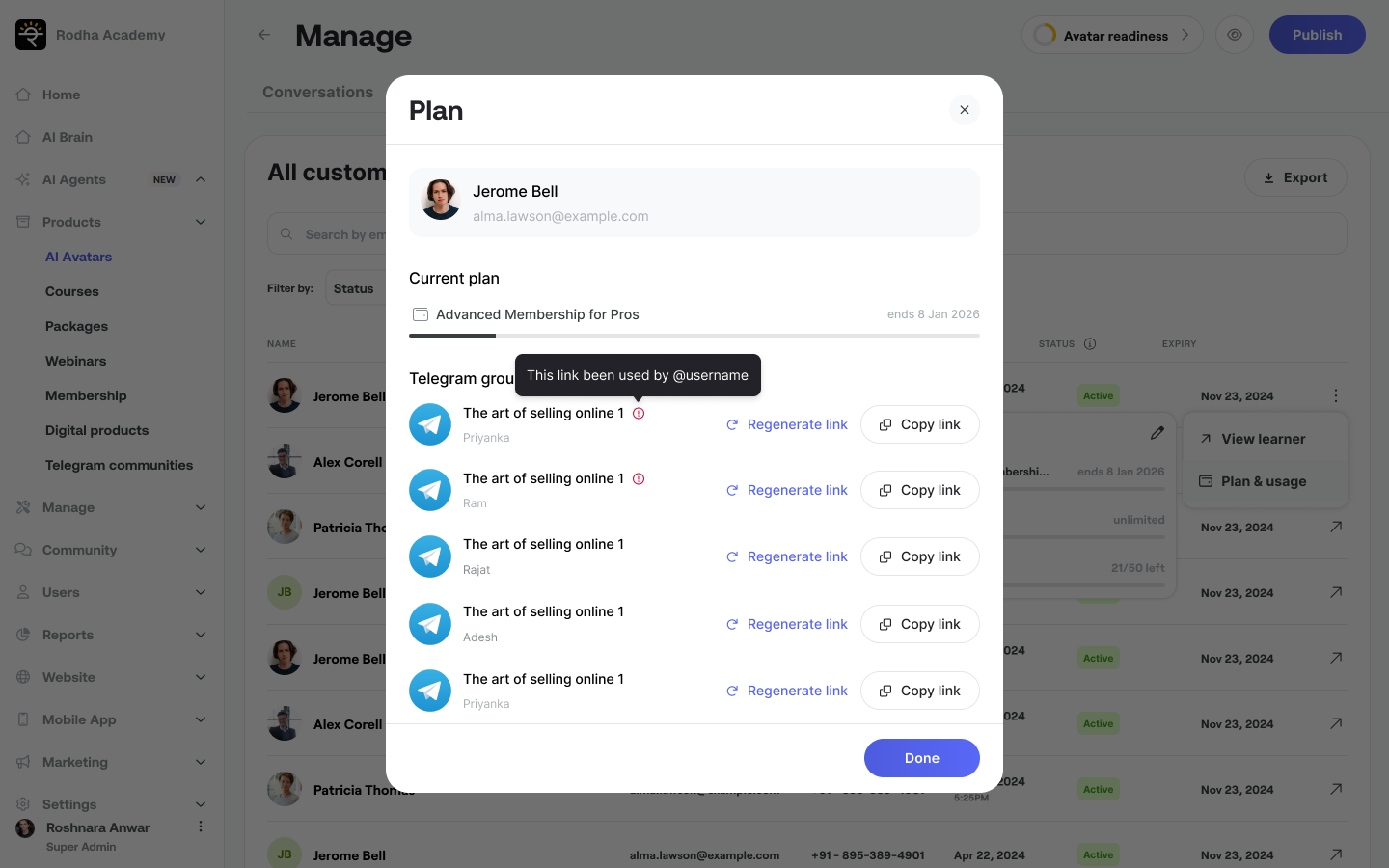 Click the "Copy link" button to copy the learner's unique Telegram joining link to your clipboard.