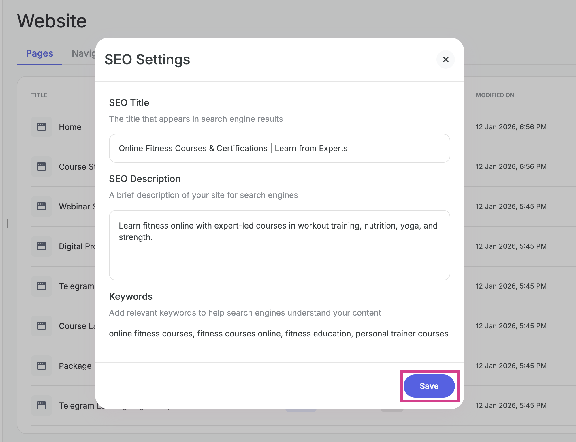 Boost your website's discoverability by optimizing your SEO title, description, and keywords for better search engine visibility. Configure meta titles and descriptions that appear in search results, target the right audience with strategic keyword placement. Whether you're new to SEO or refining your optimization strategy, this guide covers all the essential settings needed to rank higher and attract more visitors to your website.