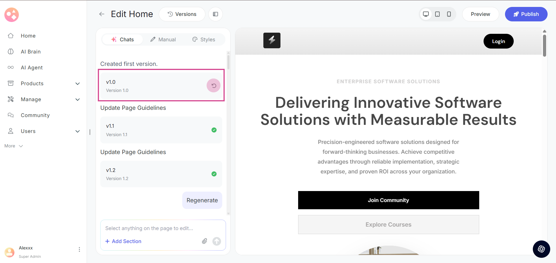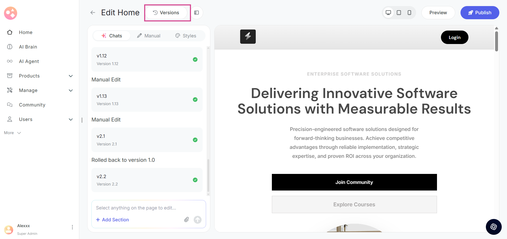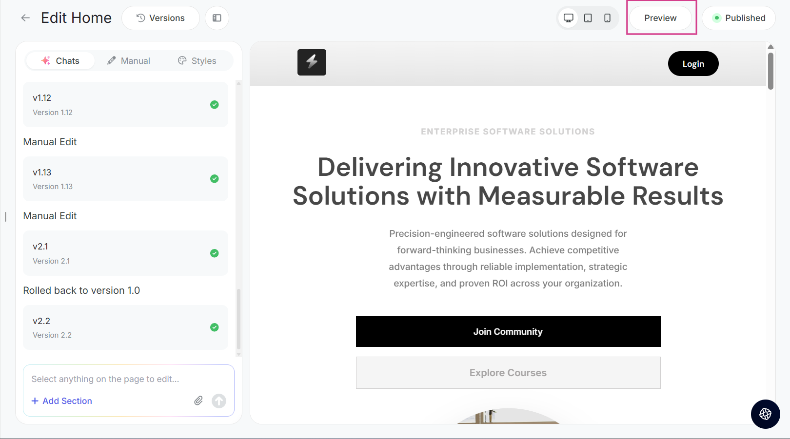 Version History keeps a complete record of all changes made to your website pages. You can easily roll back to any previous version with just a click, whether from the AI editor chat or from the Version History panel. This gives you complete confidence to make changes, knowing you can always return to an earlier version if needed.