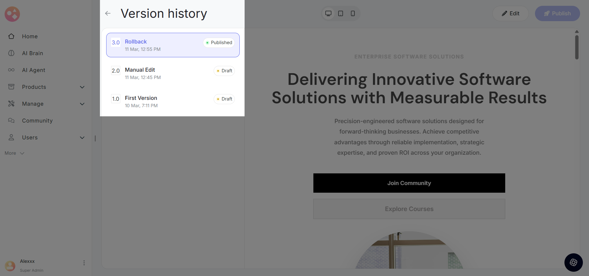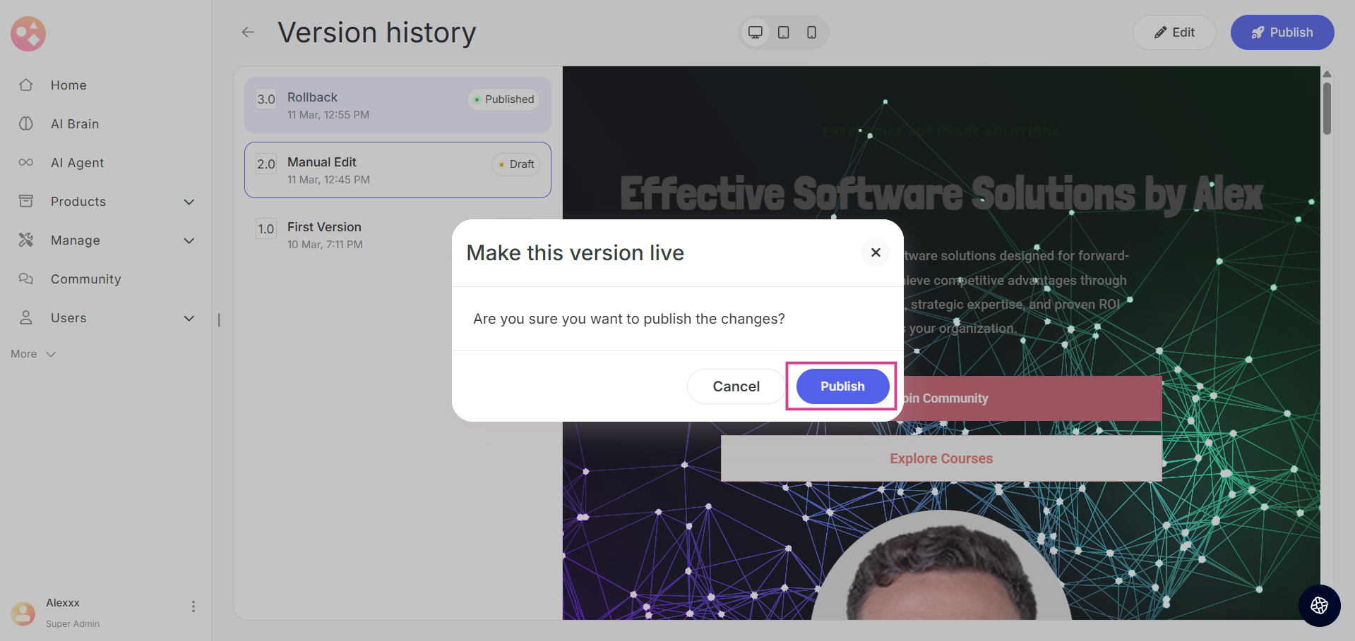 Step 3: Click on the version you want to roll back to, review it, and then publish to make that version live.