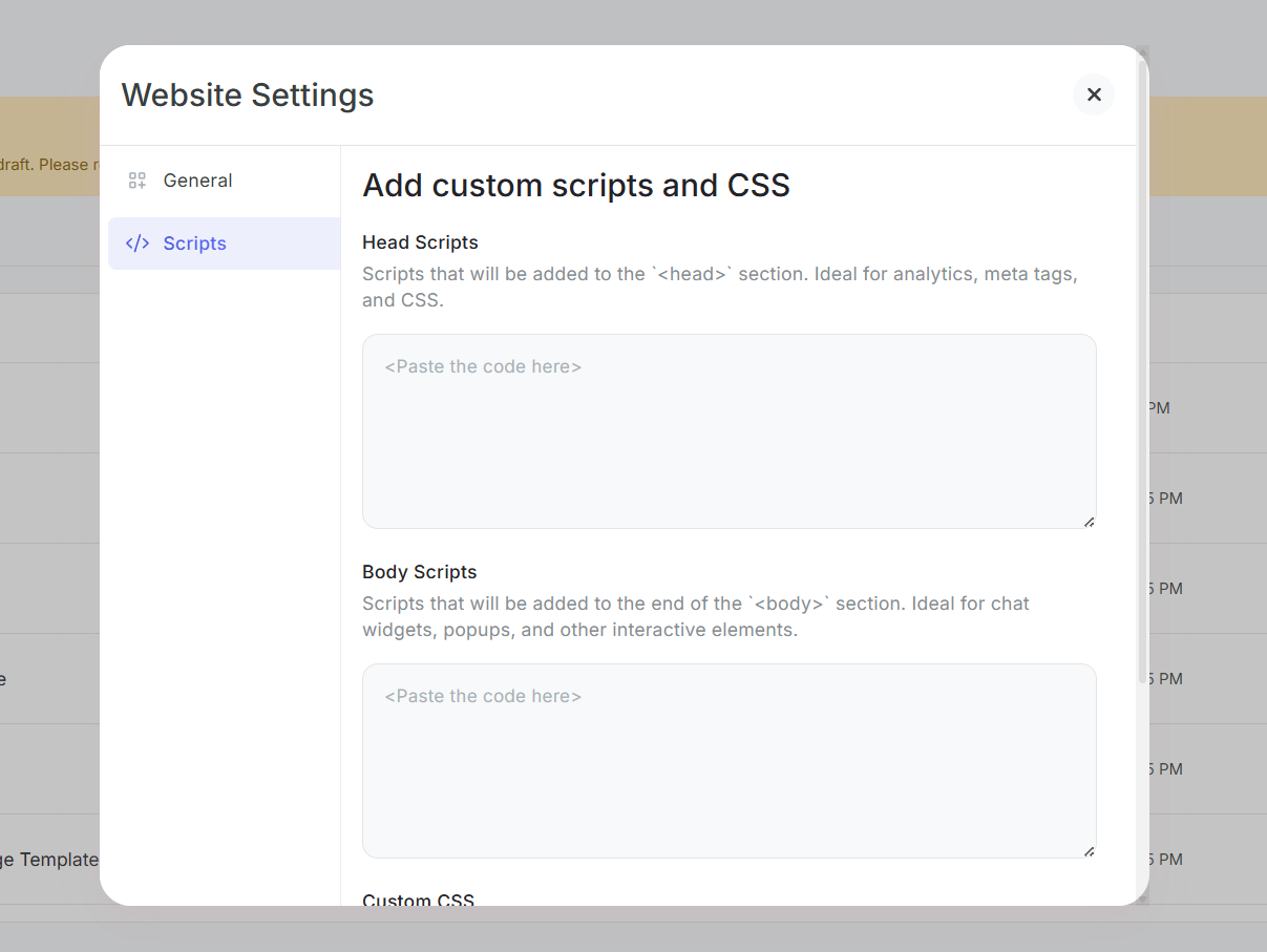 Step 10: Add custom scripts to the head or body of your site for tracking, analytics, or other integrations.