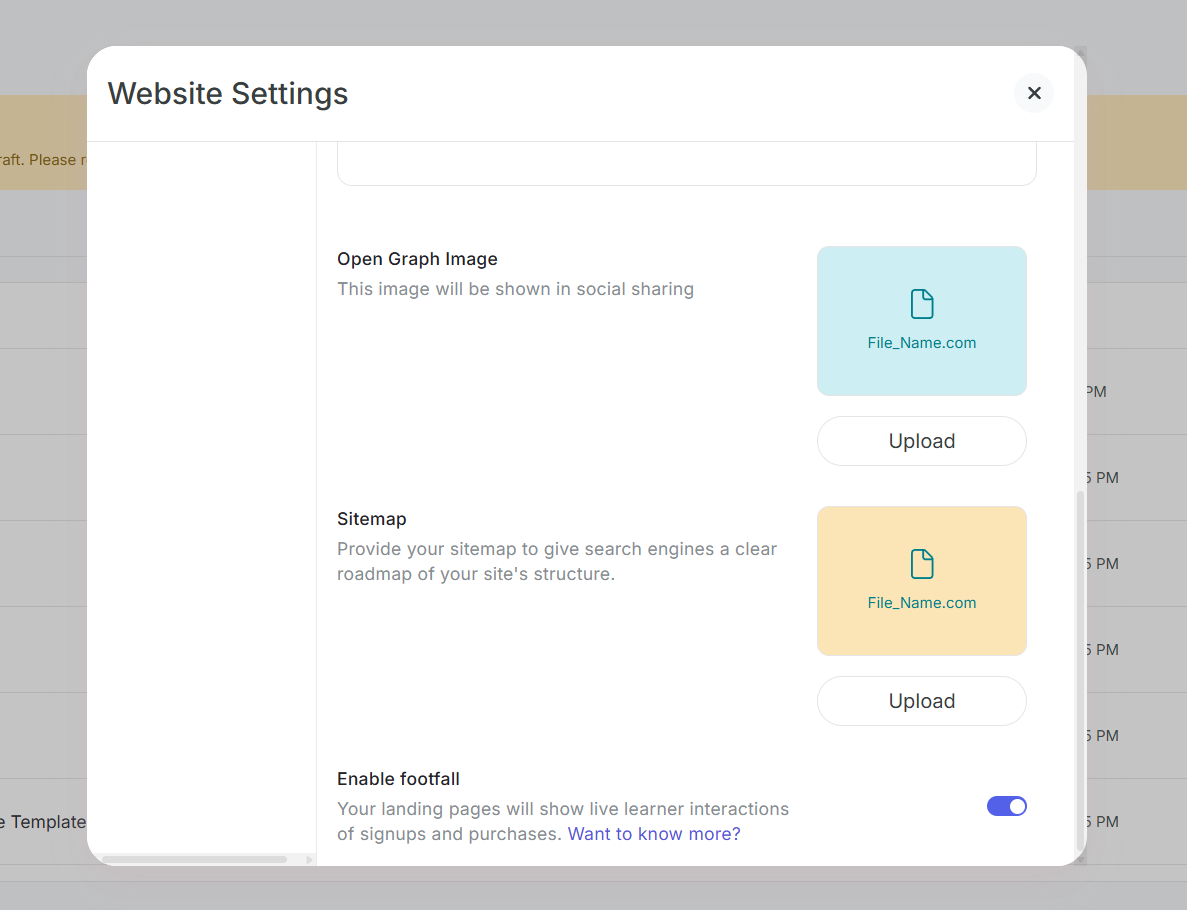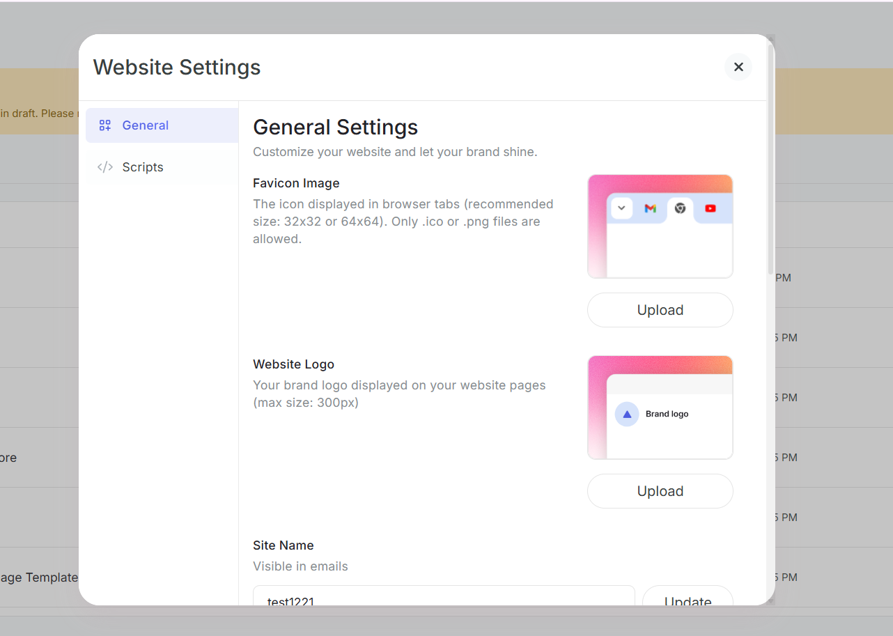 Set up your website's professional identity with logos, favicons, and custom branding that represent your business. Add advanced functionality with custom head and body scripts to integrate analytics, tracking tools, and third-party services. Whether you're launching a new website or upgrading your existing presence, this guide covers all the essential website-level settings needed to create a professional, feature-rich platform.