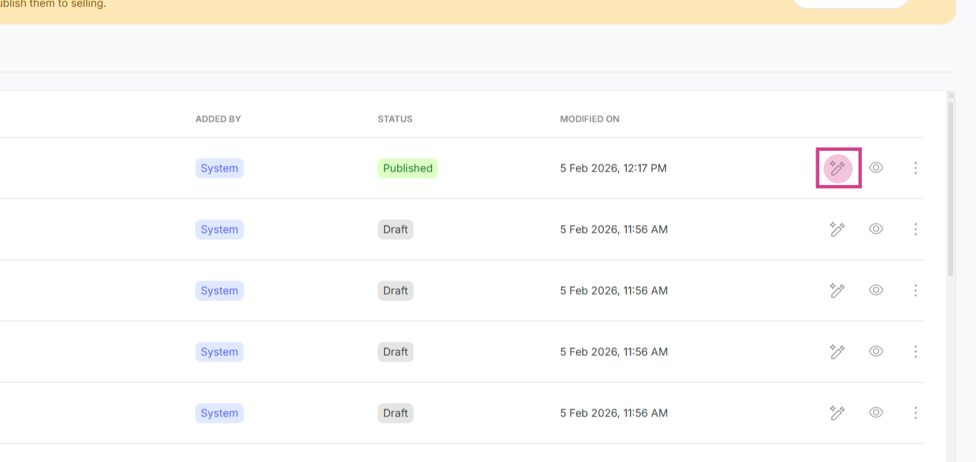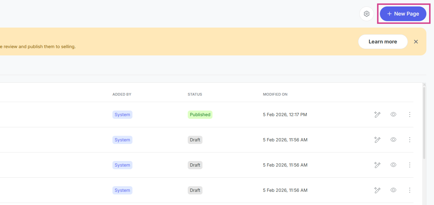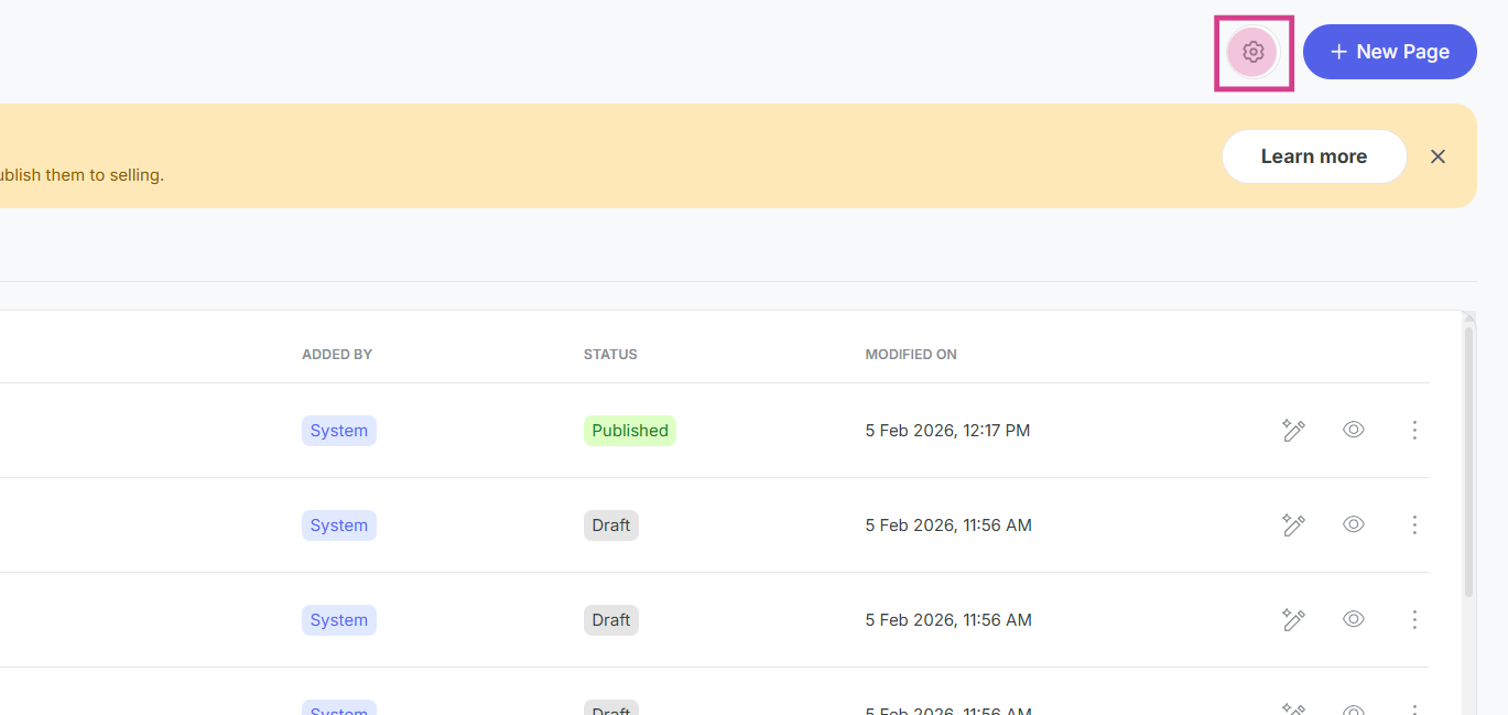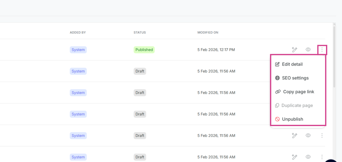 Click the three-dot menu (⋮) on any page in your Pages list to access page options. You can-