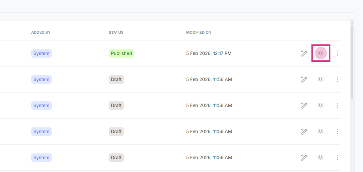 Click the preview icon (eye symbol) to see how your page looks before publishing. You can view your page design and layout visually, check how your content appears to visitors and publish when satisfied with the preview.