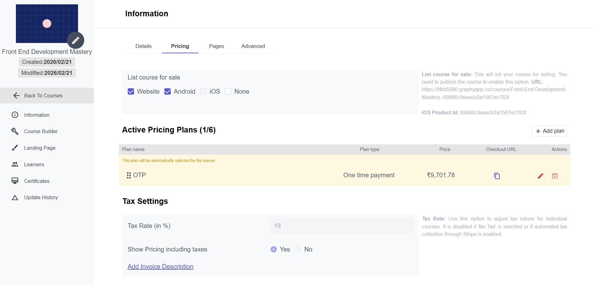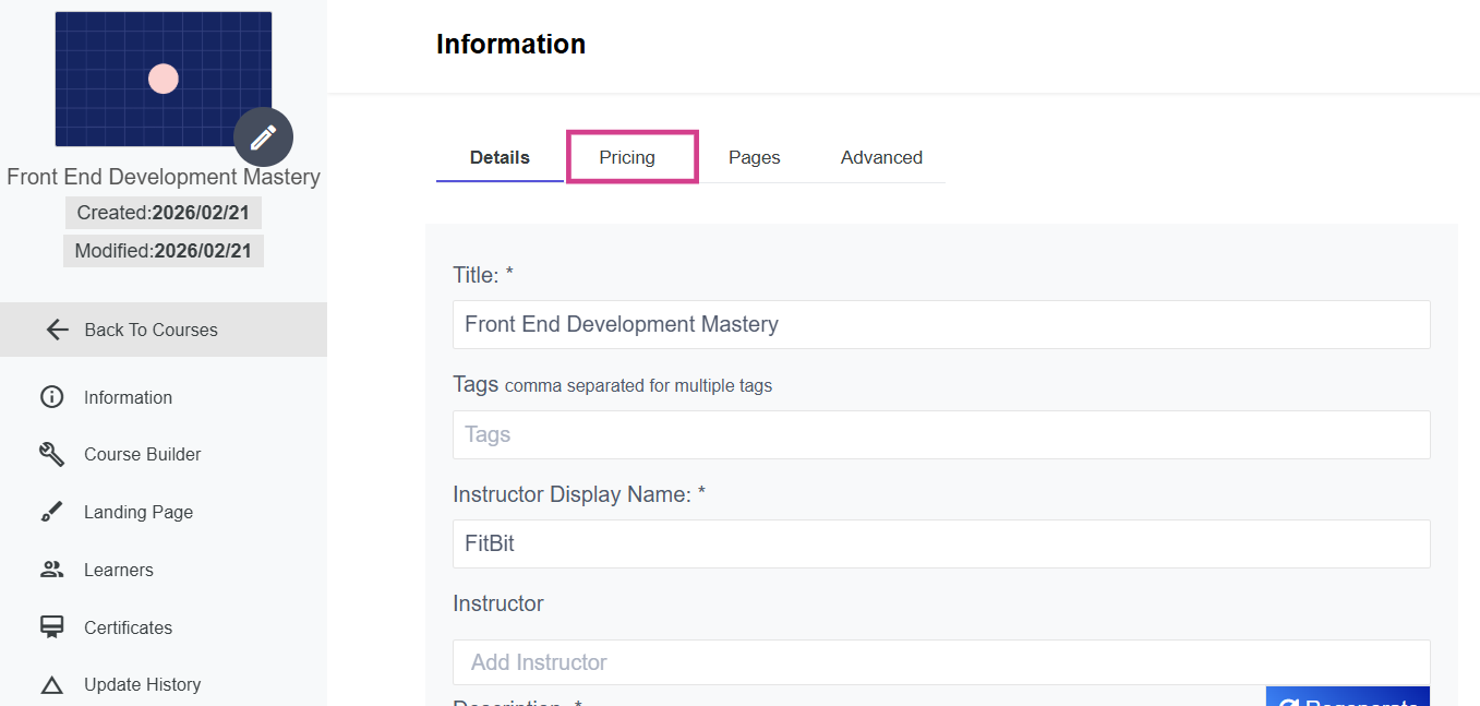 Once you have selected your course, locate and switch to the Pricing tab within the course details section. This is where all your pricing configurations and payment plans are managed.