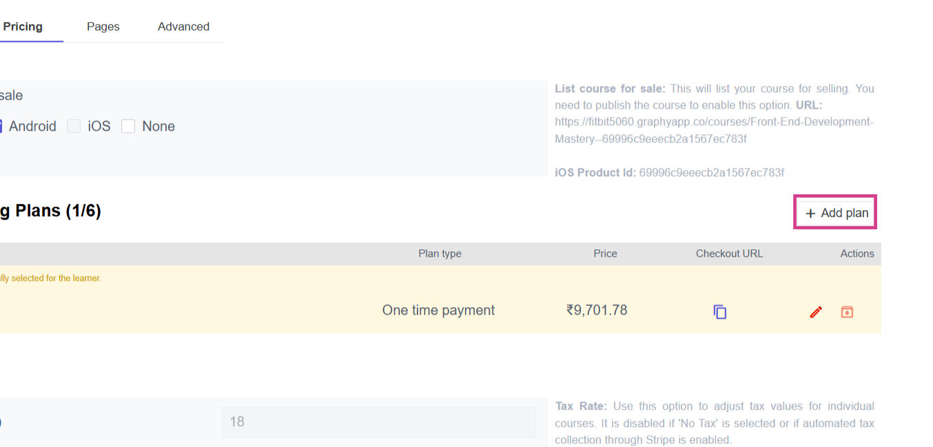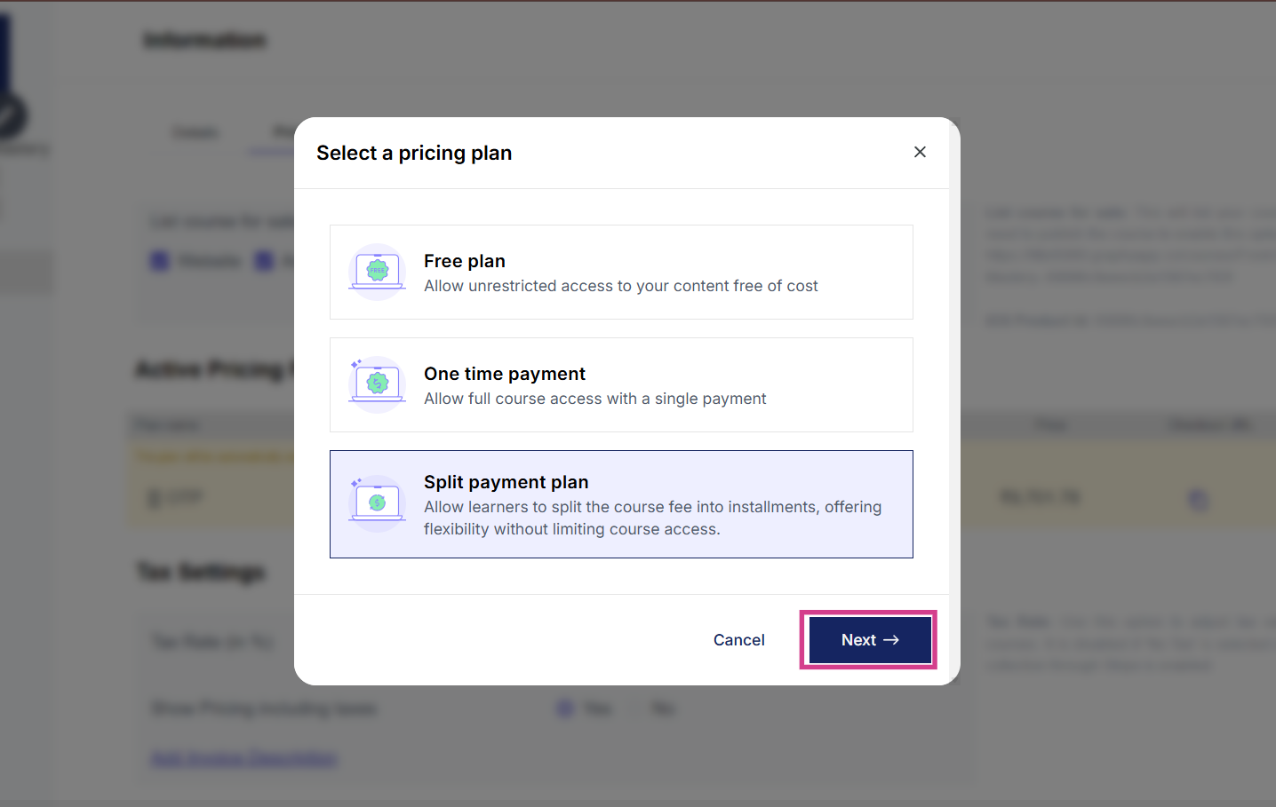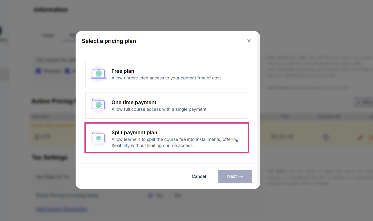 In the Pricing tab, you will see your course's pricing settings and the plan you set at the time of course creation. Review these settings to understand your current configuration before adding the new split payment plan.