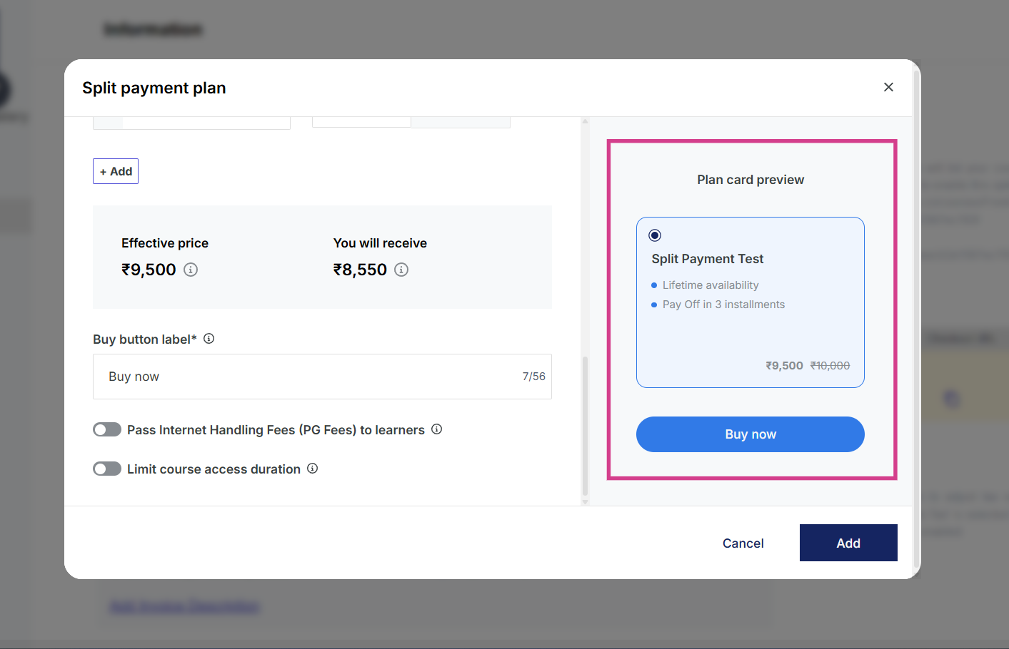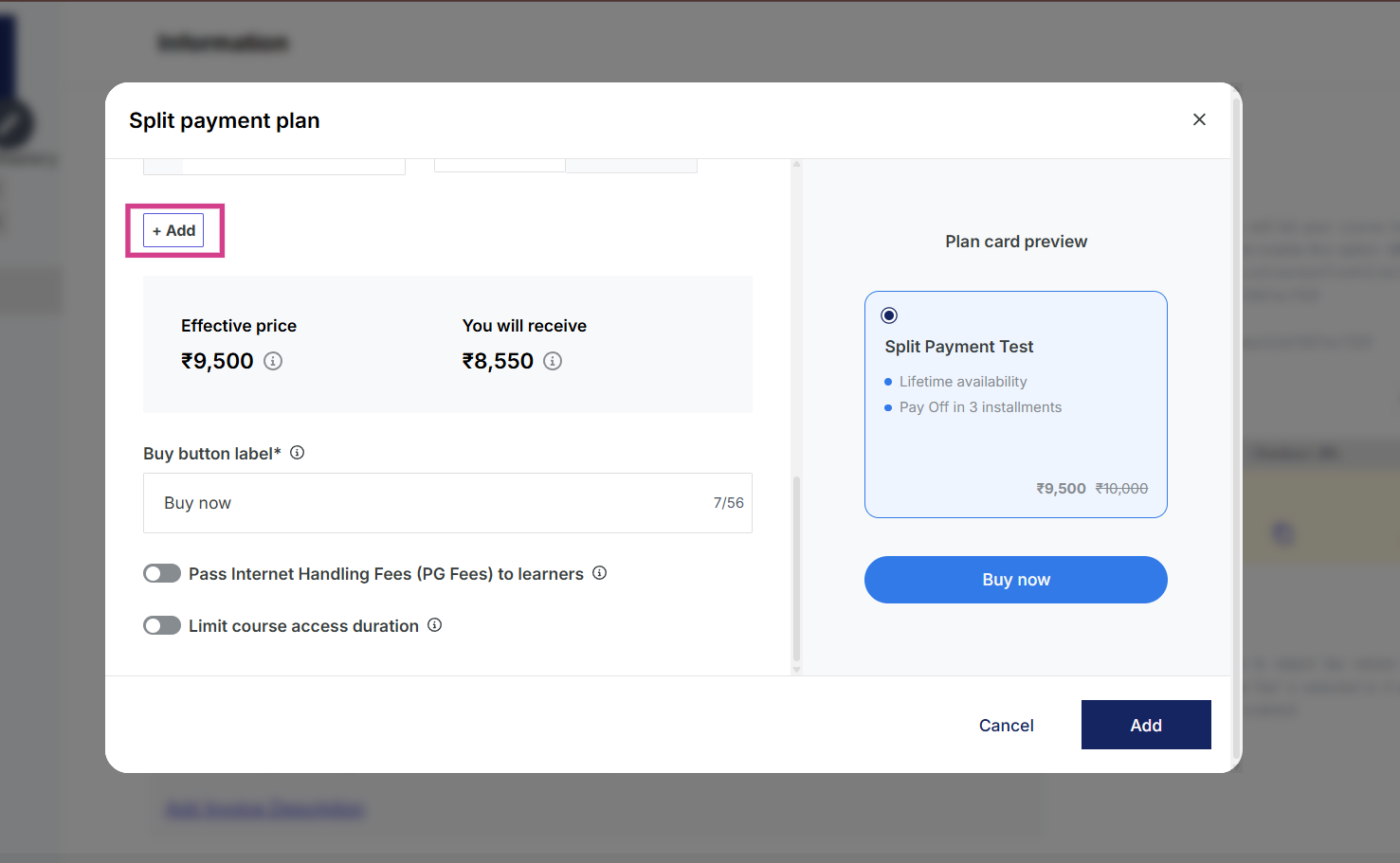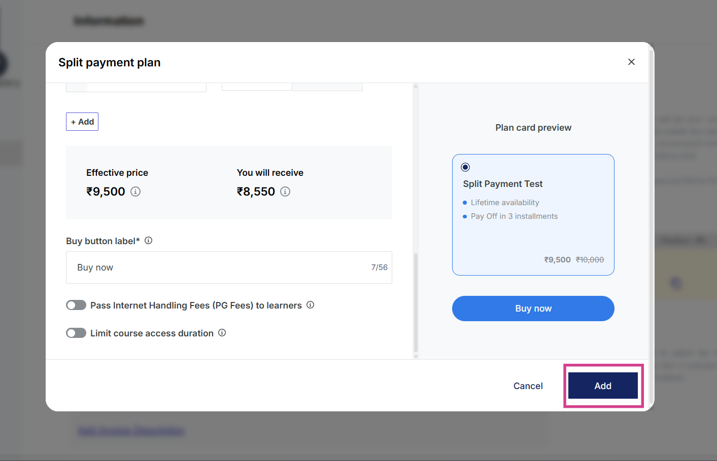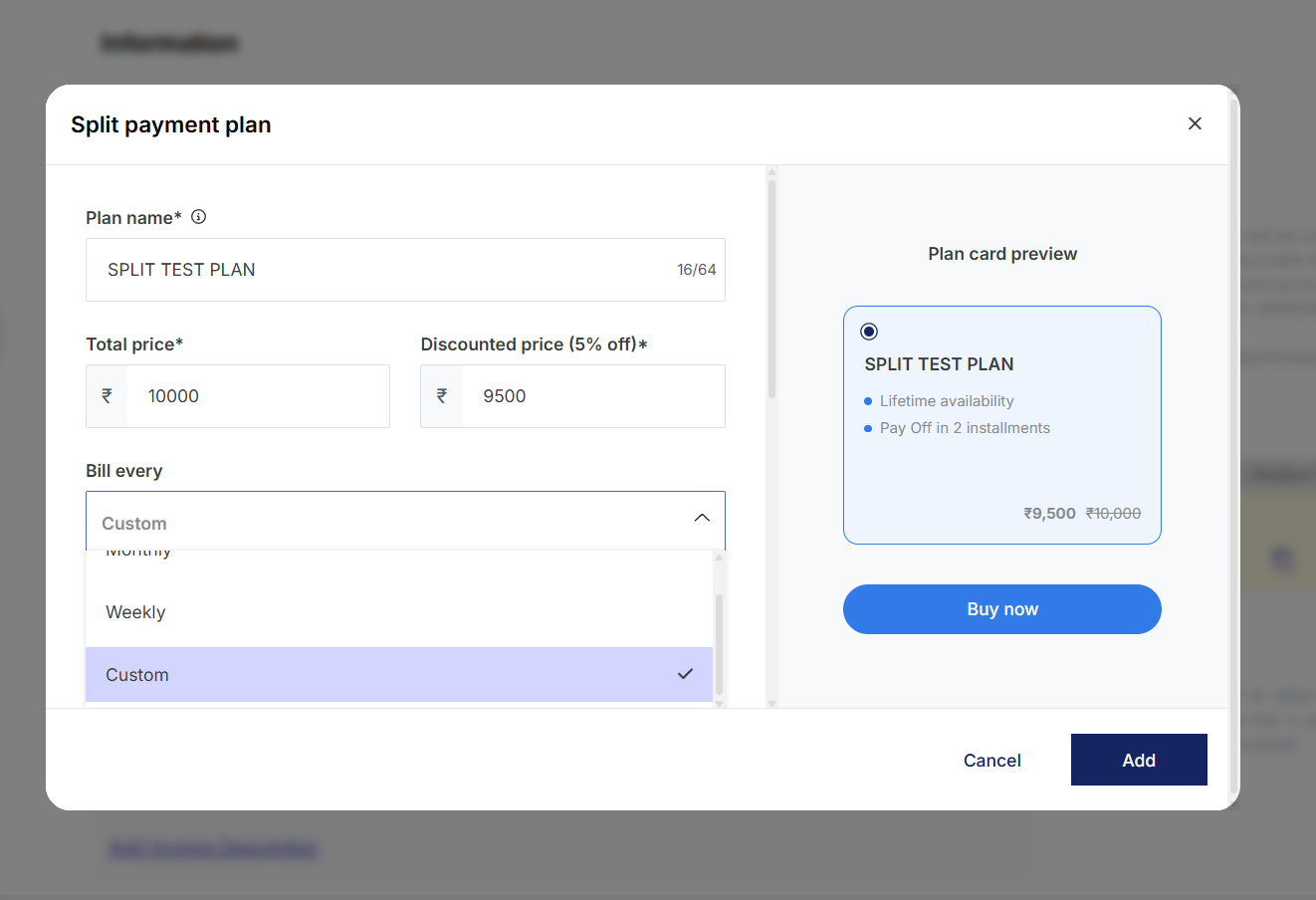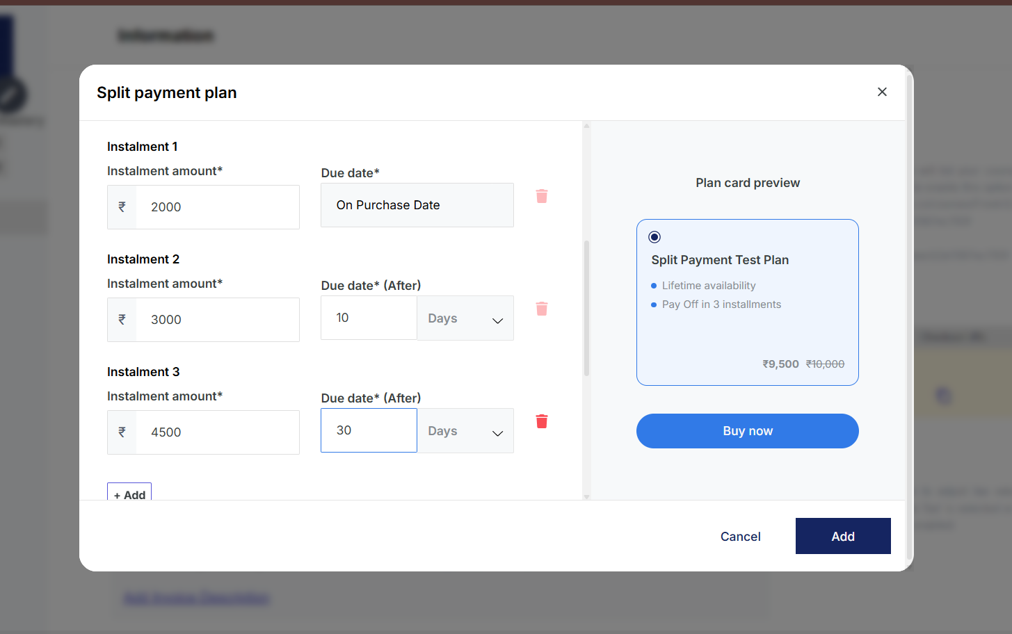 Once you are satisfied with all your configurations and the preview looks correct, click the Add button to finalize your split payment plan. Your plan will now be created and ready to use.