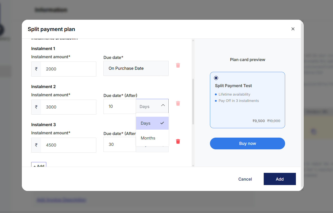 For each installment, you have the flexibility to modify the due date either after a specified number of days or months as per your requirement. Choose whichever interval best fits your payment schedule and business needs.