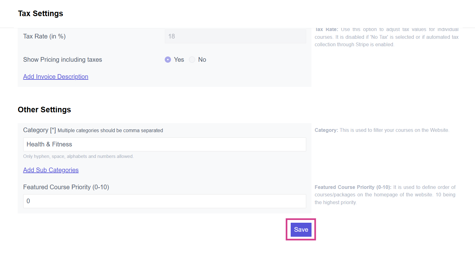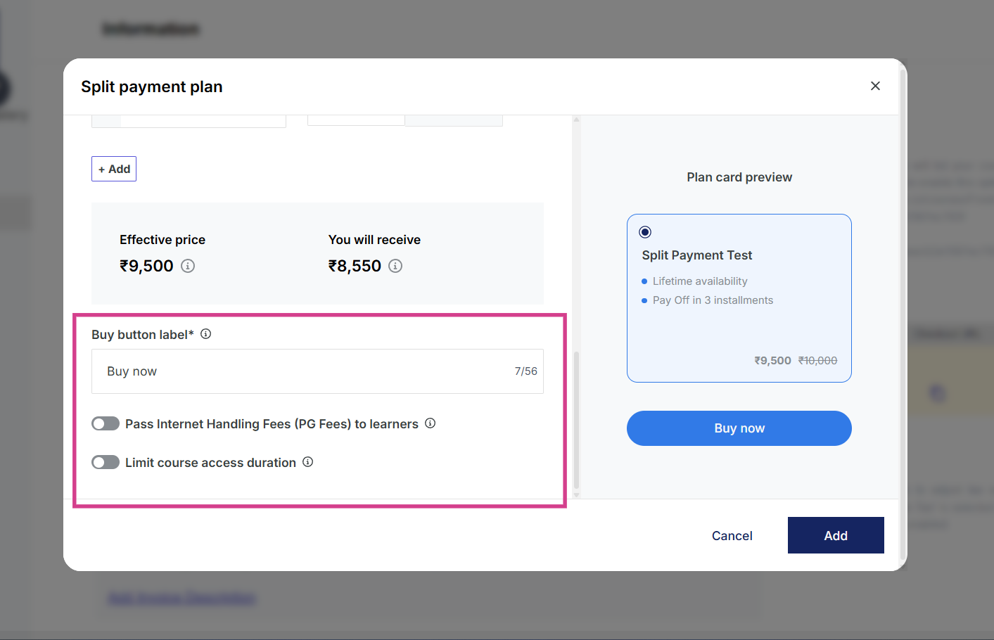 • Enable Payment Gateway Fees: Enable Pass Internet Handling Fees (PG Fees) to learners or absorb these costs yourself.