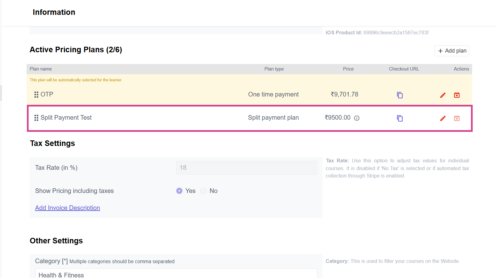You can see your split payment plan in the Active Pricing Plans tab. Your plan is now live and will be displayed to learners when they browse your course. You can view, edit, or manage this plan at any time from this section.