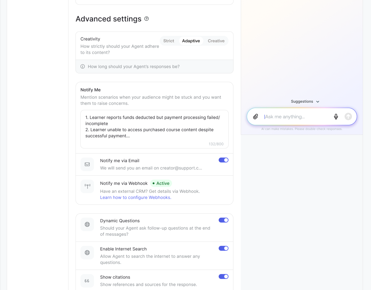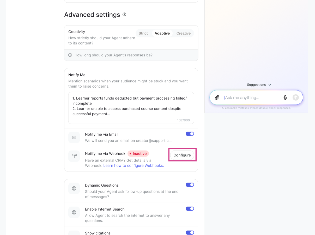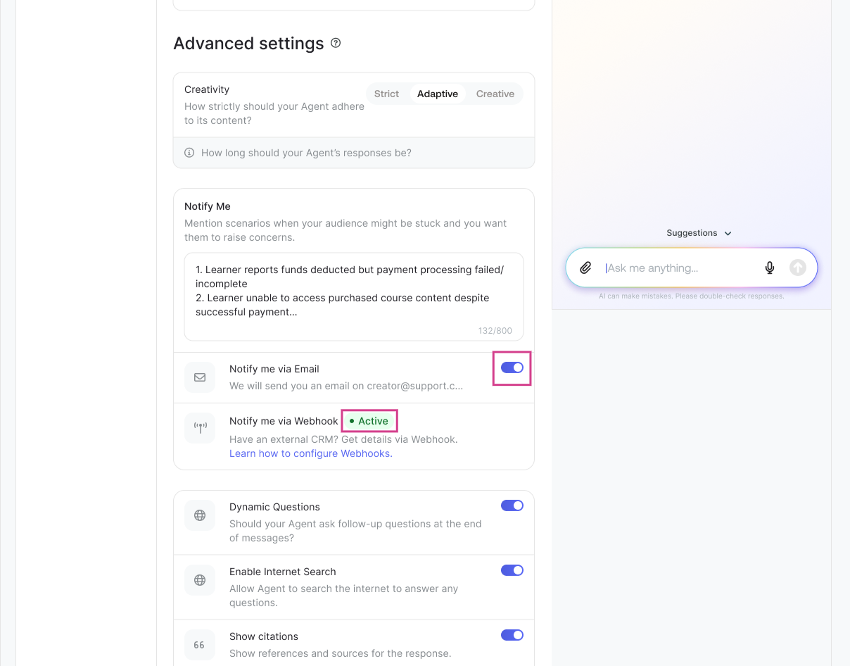 Whenever a learner escalates their concern, you will be notified via email or webhook, depending on how you configure your settings. This real-time notification system ensures you never miss critical learner issues and can respond promptly to their needs.