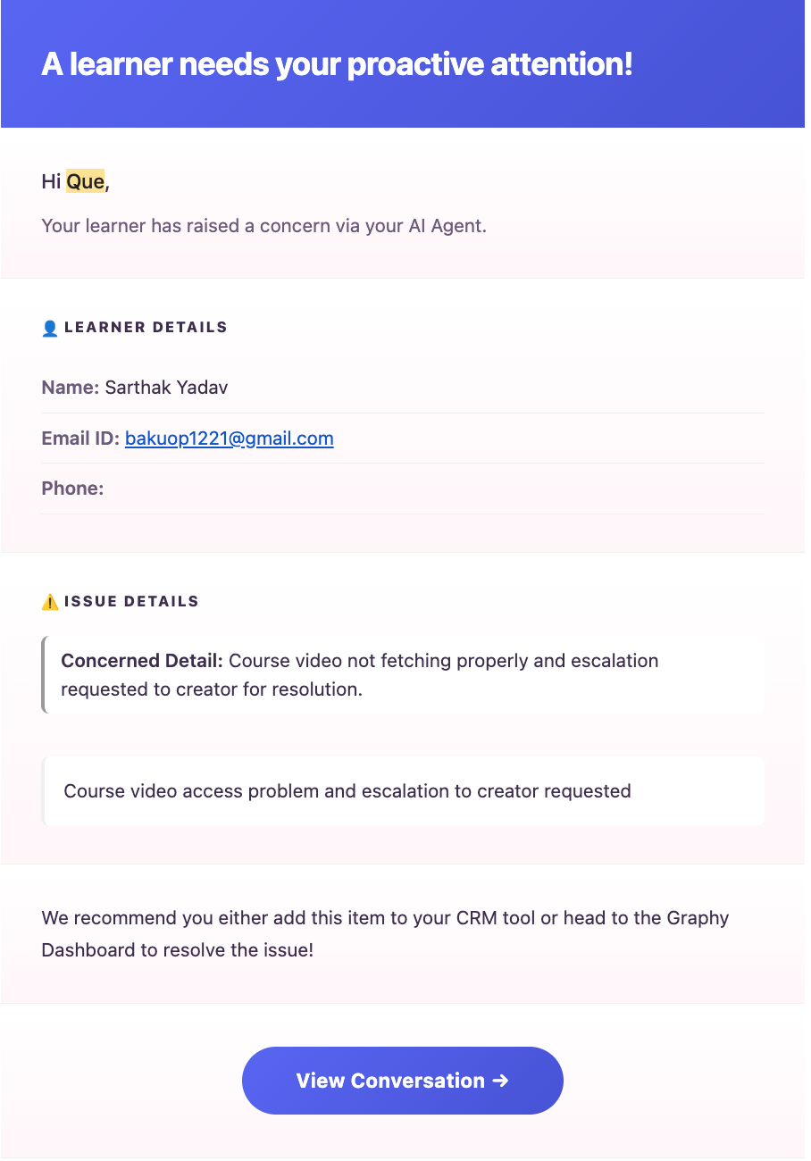 Once your learner escalates an issue to your Agent, you will be notified via email communications, example below. You can view conversation on the platform and reply to the learner.