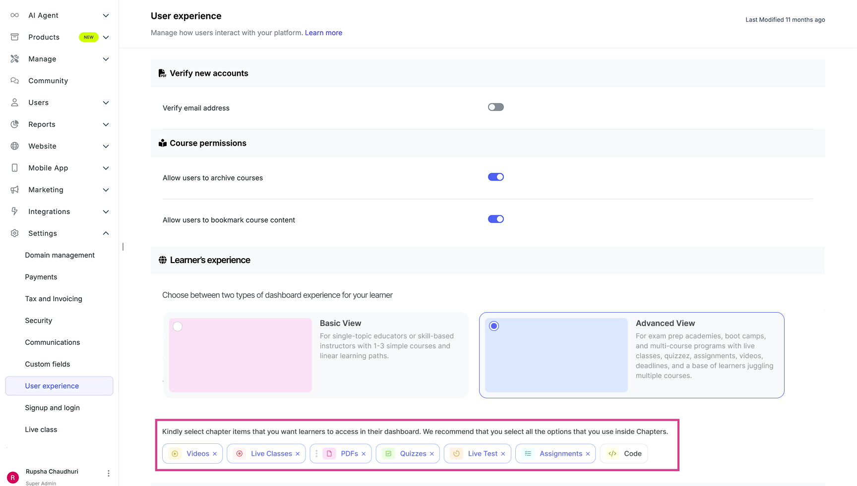Once you have enabled the advanced view, you can further customize the experience for your learners by selecting items for quick access and organising them according to your priorities. You can select or deselect quick access items, and based on that selection, it will be made visible to your learners.