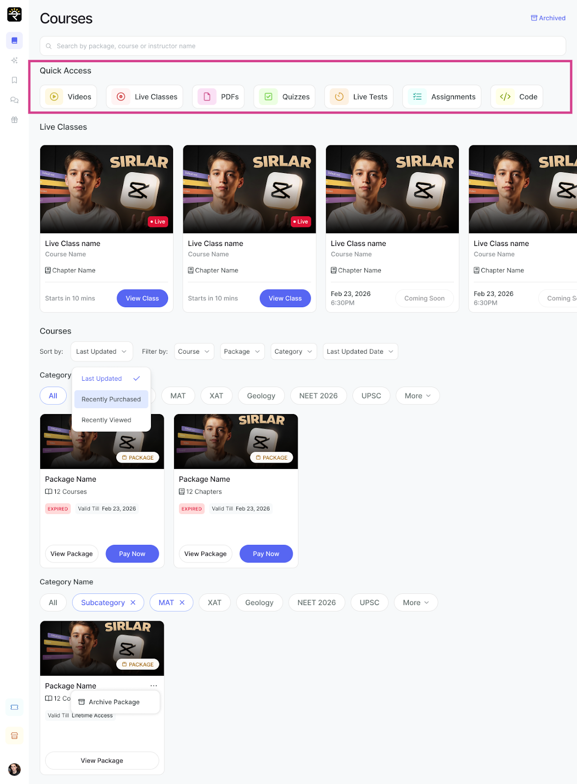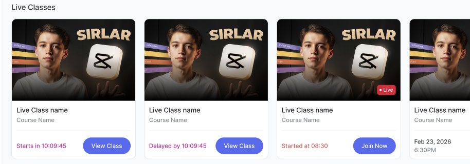 Just below Quick Access is the Live Classes section- a section of cards showing upcoming and ongoing sessions from enrolled courses. Each card will show the class name, which course it belongs to, and its current status.