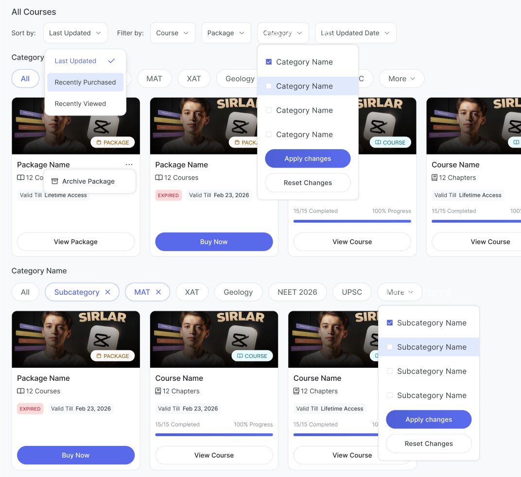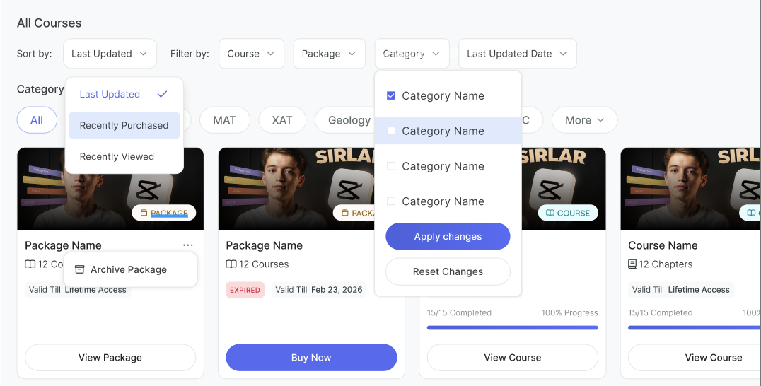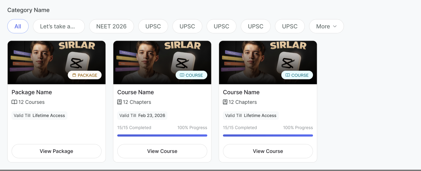 A bundle of multiple courses sold together. It shows the number of courses inside (e.g. ‘12 Courses’), access validity, and a View Package button to explore everything inside.