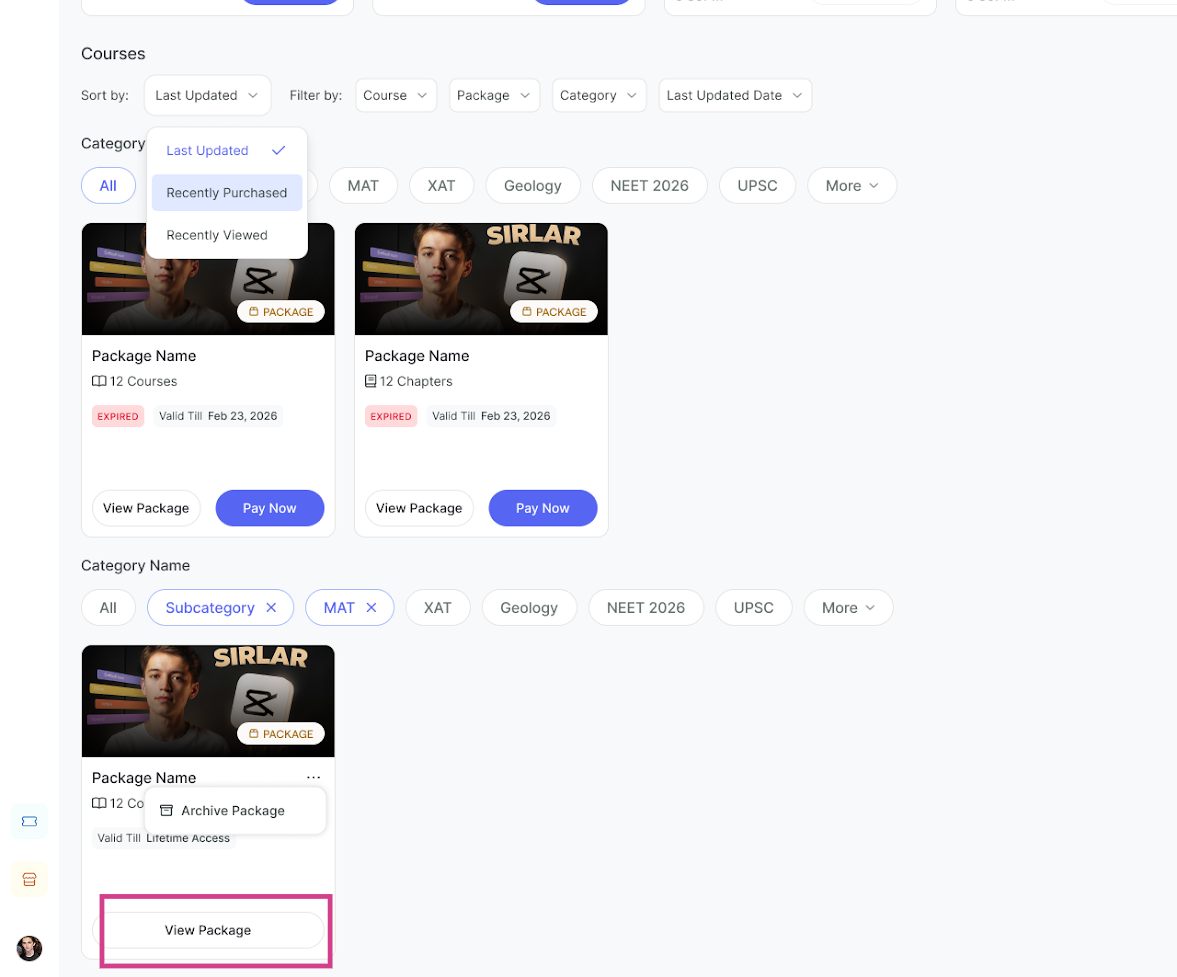 Seekhly introduces a powerful new advanced view for packages that transforms how learners search for, and accesses content. This new experience resides under Library Tab. You can land inside packages by either using the search bar or by using filters, or both, to arrive at a specific package or course inside it.
