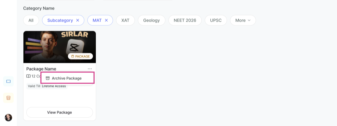 Hover over any course or package and click on the three dots menu. Select the Archive Course/Archive Package option to archive that course or package.