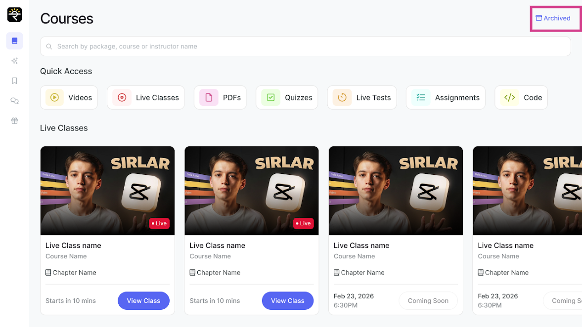 Learners can archive their courses and packages if they want to keep their learning dashboard organized and clutter-free. Archiving helps you hide courses or packages from your main view while keeping them accessible whenever you need them.