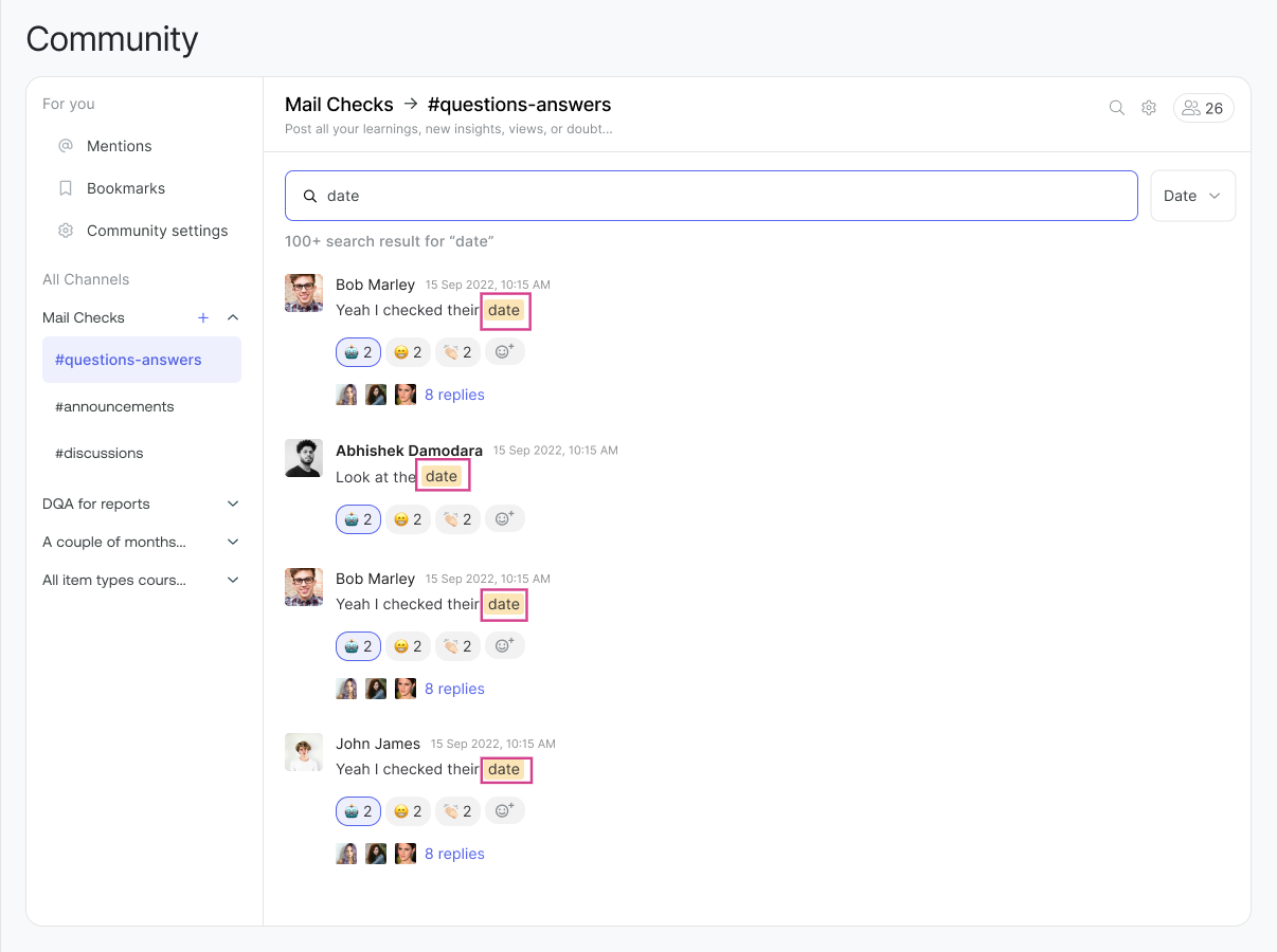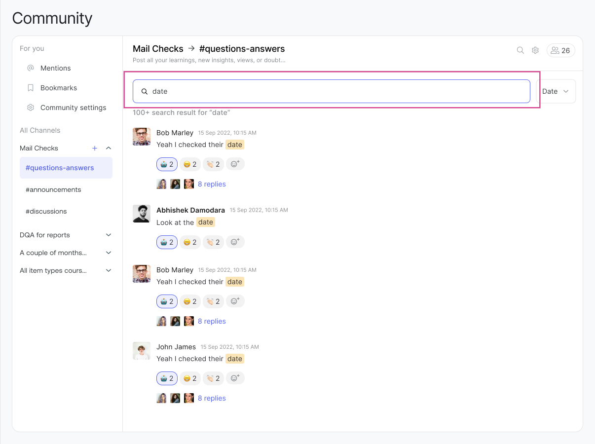 You can search for anything in the Community using our search feature. Just enter what you're looking for, and the relevant chats will appear. Your search term will be highlighted in the chat messages, and you can easily locate the same both on the conversation header.