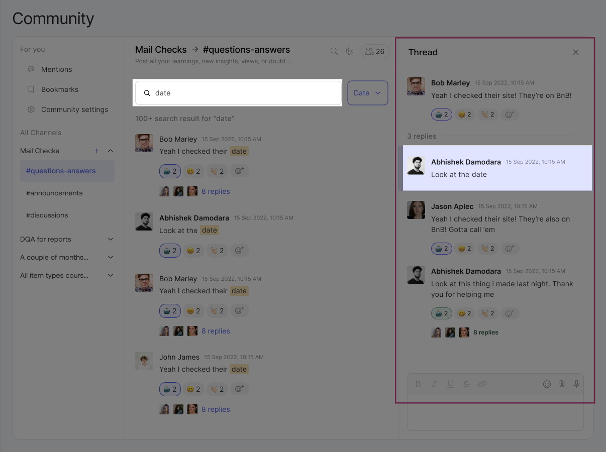 If your search term appears in a thread, the specific chat message will be highlighted within that thread. This makes it easy to find discussions without scrolling through long conversations.